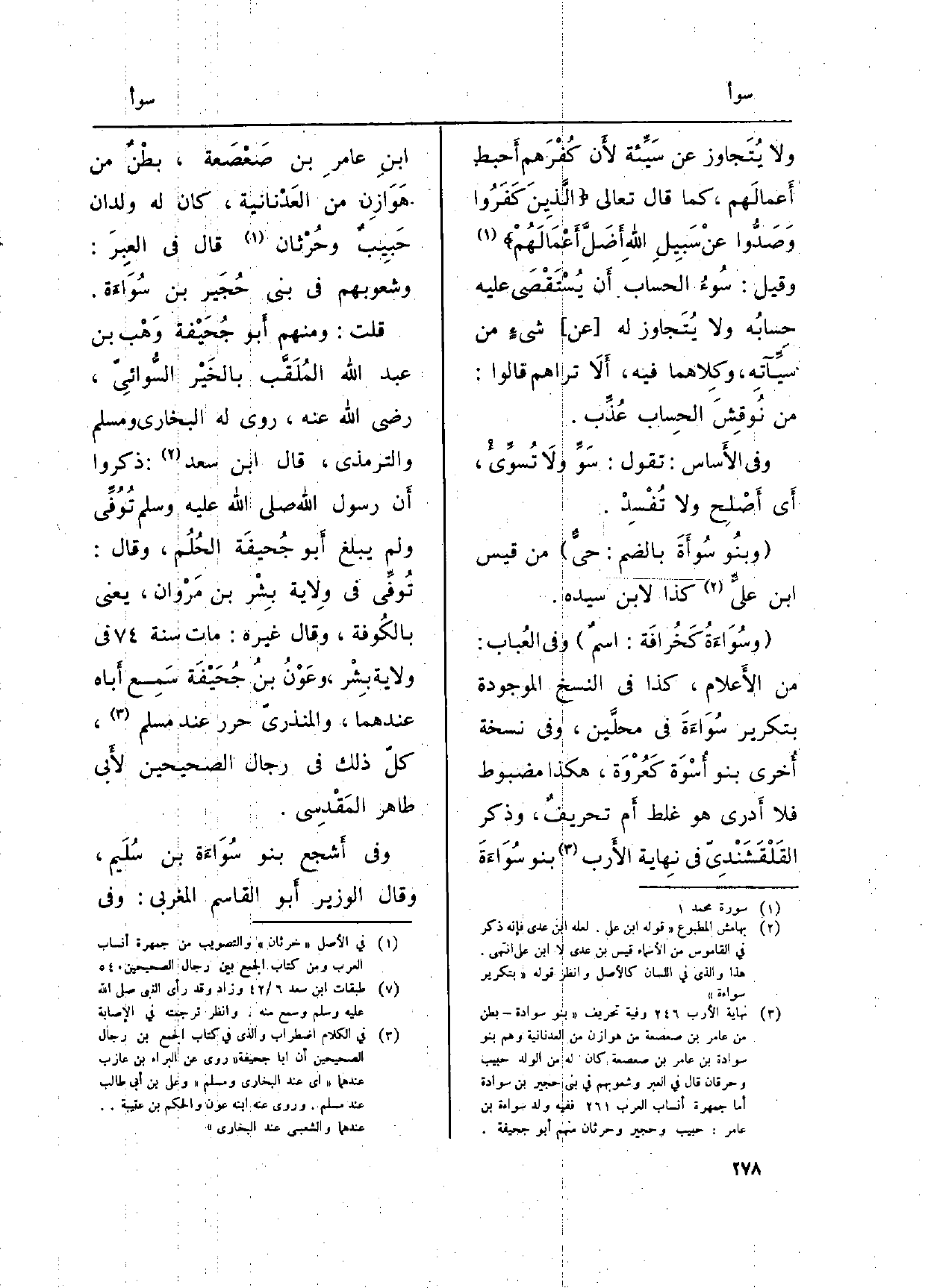 (} وسُوَاءَةُ كَخُرافَة: اسمٌ) وَفِي (العُباب) : من الأَعلام، كَذَا فِي النّسخ الْمَوْجُودَة بتكرير سُوَاءَةَ فِي محلَّين، وَفِي نُسْخَة أُخرى بَنو أُسْوَة كَعُرْوَة، هَكَذَا مضبوط فَلَا أَدري هُوَ غلط أَم تحريفٌ، وَذكر القَلْقَشَنْدِيّ فِي (نِهاية الأَرب) بَنو سُوَاءَةَ ابنِ عامرِ بن صَعْصَة، بطْنٌ من هَوَازِن من العَدْنانية، كَانَ لَهُ ولدان حَبِيبٌ وحُرْثان قَالَ فِي (العِبَر) : وشعوبهم فِي بني حُجَير بن سُواءَة.