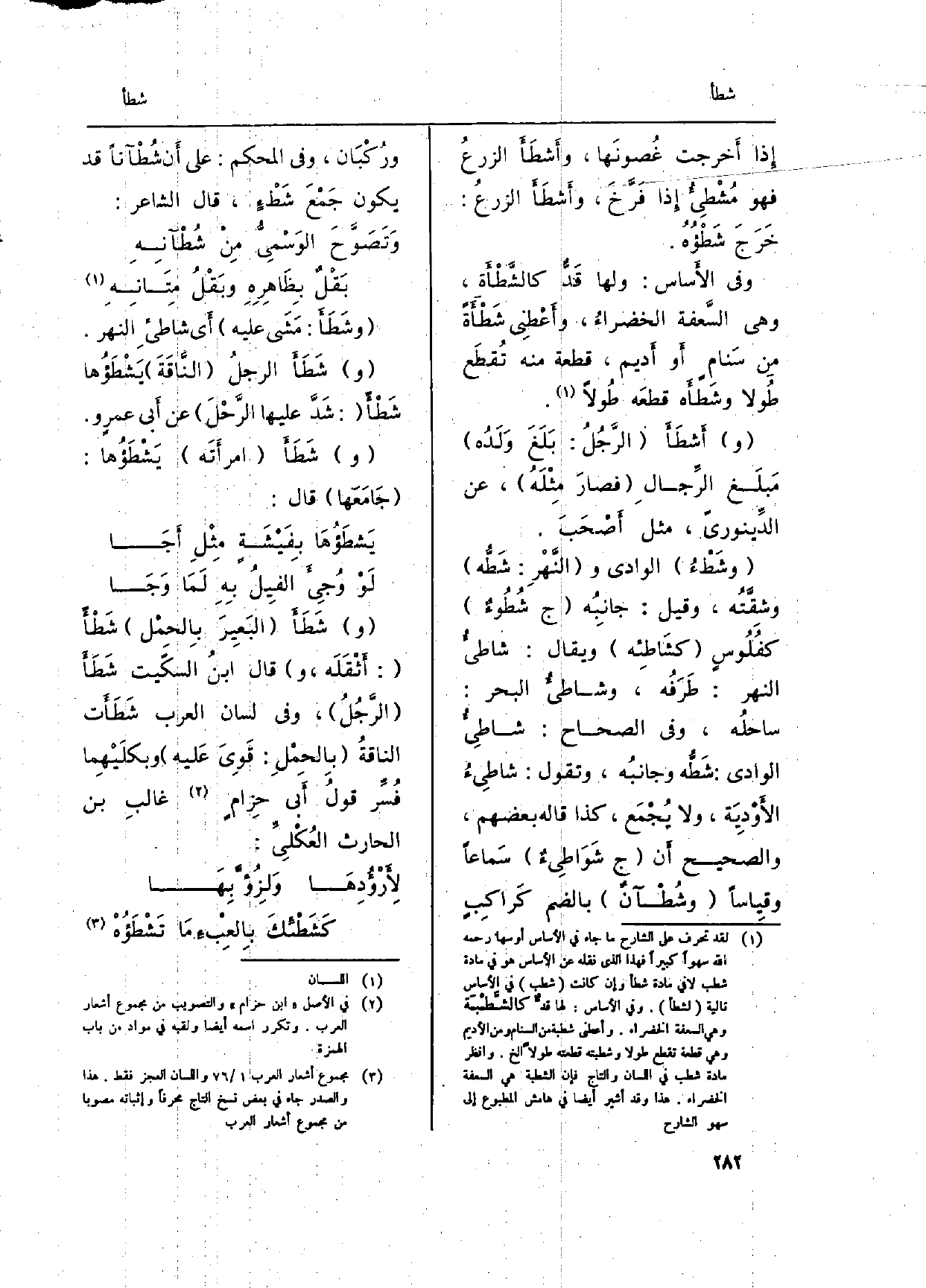 (وشَطْءُ) الْوَادي و (النَّهْرِ: شَطُّه) وشقَّتُه، وَقيل: جانِبُه (ج {شُطُوءٌ) كفُلُوسٍ (} كشَاطِئه) وَيُقَال: شاطىءُ النَّهر: طَرَفُه، {وشاطىءُ الْبَحْر: ساحلُه، وَفِي (الصِّحَاح) : شاطِىءُ الْوَادي: شَطُّه وجانبُه، وَتقول:} شاطِىءُ الأَوْدِيَة، وَلَا يُجْمَع، كَذَا قَالَه بَعضهم، وَالصَّحِيح أَن (ج {شَوَاطِىءٌ) سَماعاً وقِياساً (} وشُطْآنٌ) باضم كَراكِبٍ ورُكْبَان، وَفِي (الْمُحكم) : على أَن شُطْآناً قد يكون جَمْعَ شَطْءٍ، قَالَ الشَّاعِر:
