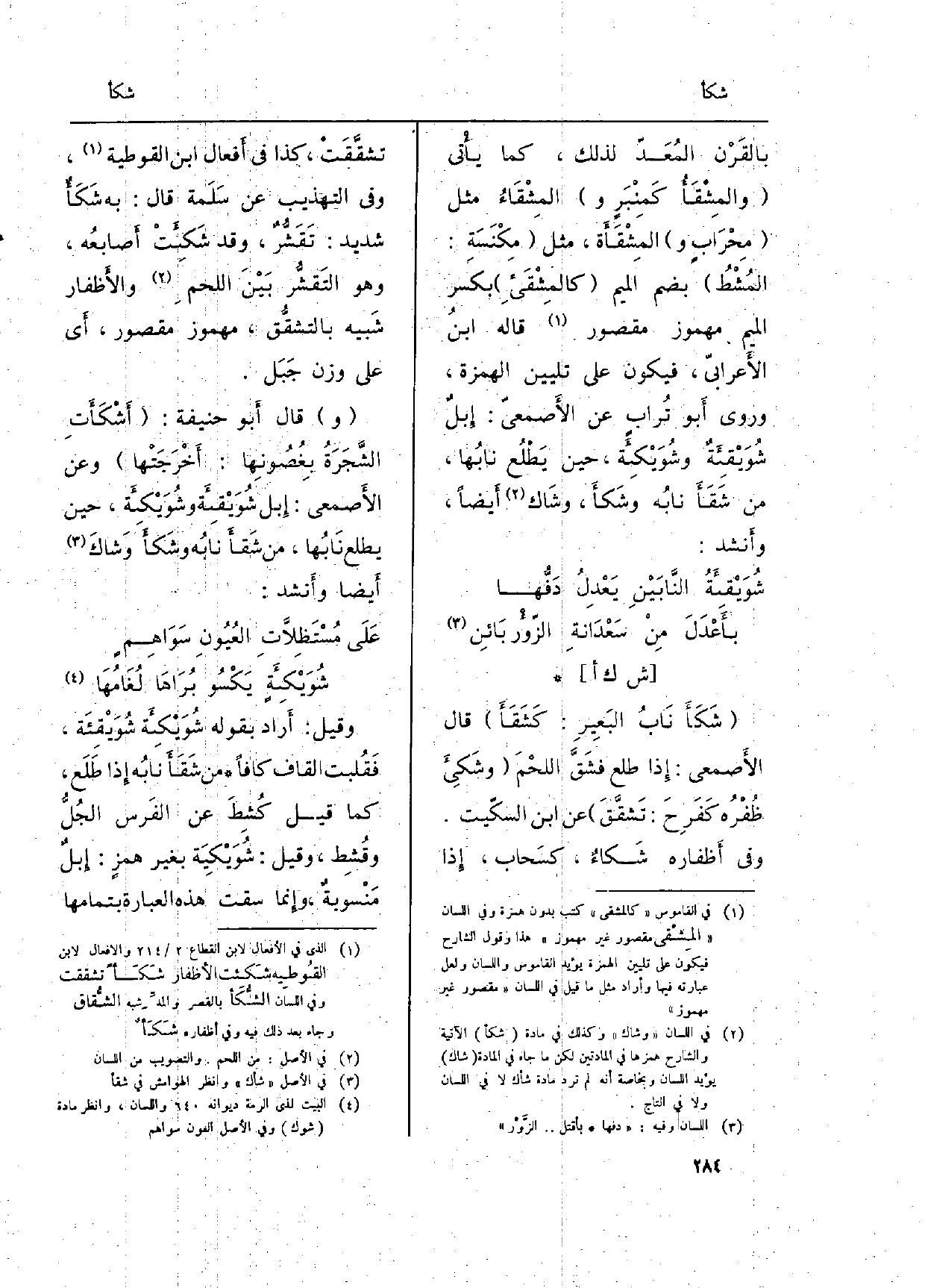 وَقيل: أَراد بقوله شُوَيْكِئَة شُوعيْقِئَة، فَقُلبت الْقَاف كافاً. من شَقَأَ نابُه إِذا طَلَع، كَمَا قيل كُشِطَ عَن الفَرس الجُلُّ وقُشِط، وَقيل:! شُوَيْكِيَة بِغَيْر همزٍ: إِبلٌ مَنحسوبةٌ، وإِنما سقت هَذِه الْعبارَة بِتَمَامِهَا