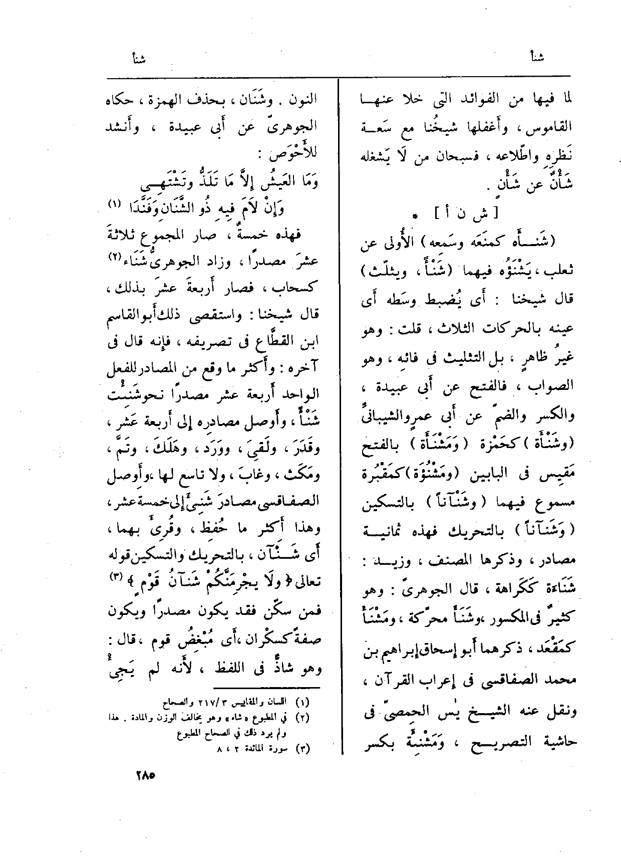 فَهَذِهِ خمسةٌ، صَار الْمَجْمُوع ثلاثةَ عشرَ مصدرا، وَزَاد الجوهريُّ} شَنَاء كسحاب، فَصَارَ أَربعة عشرَ بذلك، قَالَ شَيخنَا: واستقصى ذَلِك أَبو الْقَاسِم ابْن القطَّاع فِي تصريفه، فإِنه قَالَ فِي آخِره: وأَكثر مَا وَقع من المصادر للْفِعْل الْوَاحِد أَربعة عشر مصدرا نَحْو {شَنِئْت شَنْأً، وأَوصل مصادِره إِلى أَربعة عَشر، وقَدَرَ، ولَقِيَ، ووَرَد، وهَلَكَ، وتَمَّ، ومَكَث، وغابَ، وَلَا تَاسِع لَهَا، وأَوصل الصفاقسي مصادرَ} شَنِىءَ إِلى خَمْسَة عشر، وَهَذَا أَكثر مَا حُفِظ، وقِرىءَ بهما، أَي! شَنْآن، بِالتَّحْرِيمِ والتسكين قَوْله تَعَالَى {1. 020 5 وَلَا يجرمنكم شنآن قوم} (الْمَائِدَة: 2) فَمن سكّن فقد يكون مصدرا وَيكون صفة كسكْران، أَي مُبْغِضُ قوم، قَالَ: وَهُوَ شاذٌّ فِي اللَّفْظ، لأَنه لم يَجِيءْ