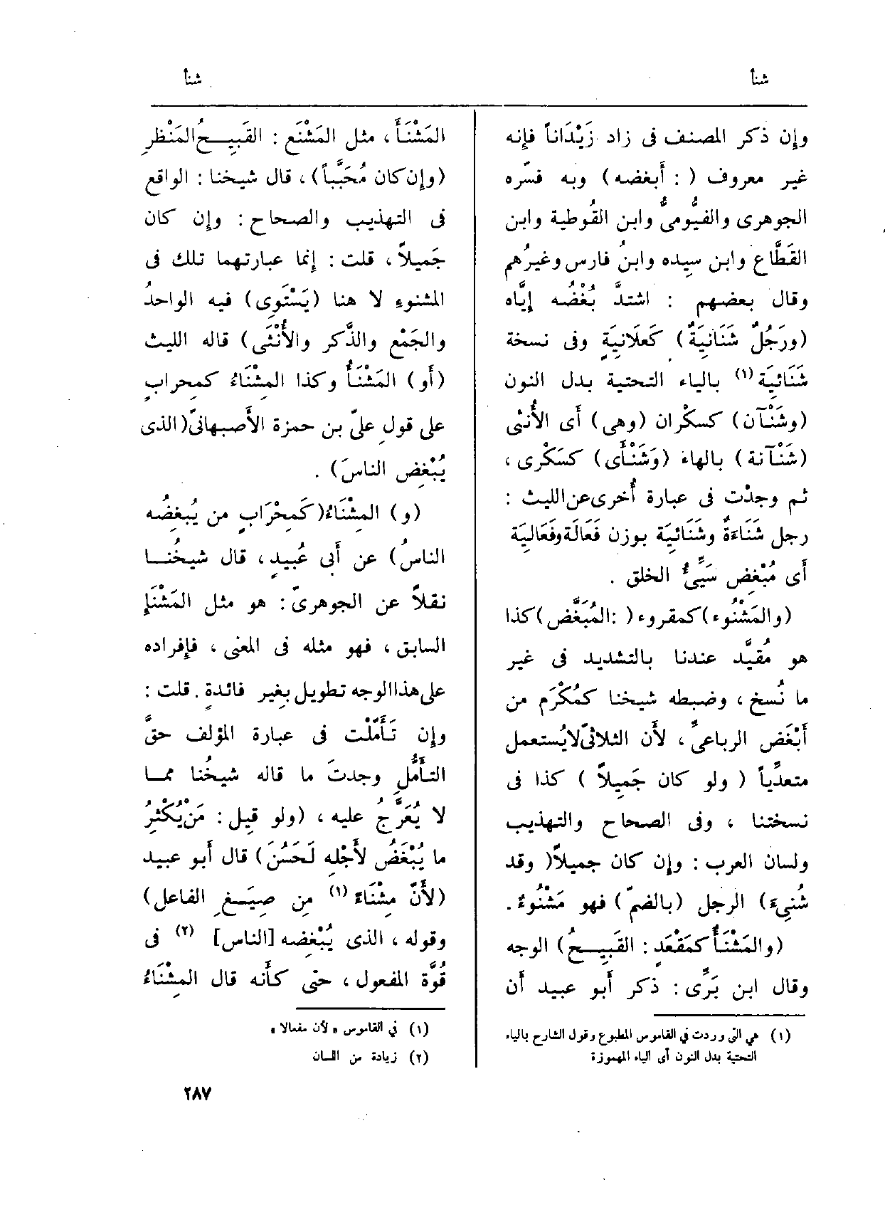 (} والمَشْنَأٌ كمَقْعَدٍ: القَبِيحُ) الْوَجْه وَقَالَ ابْن بَرِّي: ذكر أَبو عبيد أَن المَشْنَأَ، مثل المَشْنَع: القَبِيحُ المَنْظرِ (وإِن كَانَ مُحَبَّباً) ، قَالَ شَيخنَا: الْوَاقِع فِي (التَّهْذِيب) و (الصِّحَاح) : وإِن كَانَ جَميلاً، قلت: إِنما عبارتهما تِلْكَ فِي المشنوءِ لَا هُنَا (يَسْتَوِي) فِيهِ الواحدُ والجَمْع والذَّكر والأُنْثَى قَالَه اللَّيْث (أَو) المَشْنَأُ وَكَذَا المشْنَاءُ كمحراب على قولِ عليّ بن حَمْزَة الأَصبهانيّ (الَّذِي يُبْغِض الناسَ) .