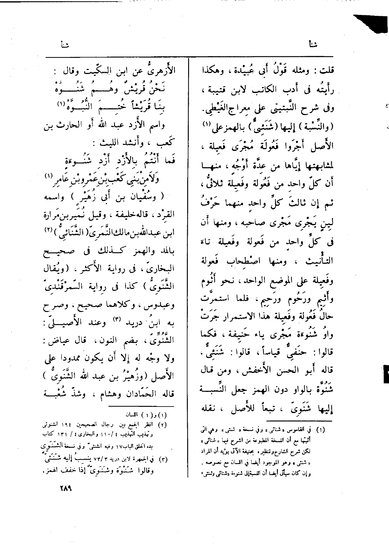 قلت: وَمثله قَوْلُ أَبي عُبيْدة، وَهَكَذَا رأَيتُه فِي أَدب الْكَاتِب لِابْنِ قُتَيْبَة، وَفِي شرح النَّبتيتي على مِعراج الغَيْطِي. (والنِّسْبة) إِليها ( {- شَنَئِيٌّ) بِالْهَمْز على الأَصل أَجْرَوا فَعُولَة مُجْرَى فَعِيلة، لمشابهتها إِيَّاها من عِدَّة أَوْجُهٍ، مِنْهَا أَن كلّ واحدِ من فَعُولة وفَعِيلة ثلاثيُّ، ثمَّ إِن ثالثَ كلِّ واحدٍ مِنْهُمَا حَرْفُ لِينٍ يَجْرِي مَجْرى صَاحبه، وَمِنْهَا أَن فِي كلِّ واحدٍ من فَعولة وفَعيلة تاءَ التأْنيث، وَمِنْهَا اصْطِحاب فَعولة وفَعِيلة على الْموضع الْوَاحِد، نَحْو أَثُوم وأَثِيم ورَحُوم ورَحِيم، فَمَا استمرَّت حالُ فَعُولة وفَعِيلة هَذَا الِاسْتِمْرَار جَرَتْ واوُ شَنُوءَة مَجْرى يَاء حَنِيفة، فَكَمَا قَالُوا: حنَفِيٌّ قِيَاسا، قَالُوا: شَنَئِيٌّ، قَالَه أَبو الْحسن الأَخفش، وَمن قَالَ شَنُوَّة بِالْوَاو دون الْهَمْز جعل النِّسبة إِليها شَنَوِيّ، تبعا للأَصل، نَقله الأَزهريُّ عَن ابْن السكّيت وَقَالَ: