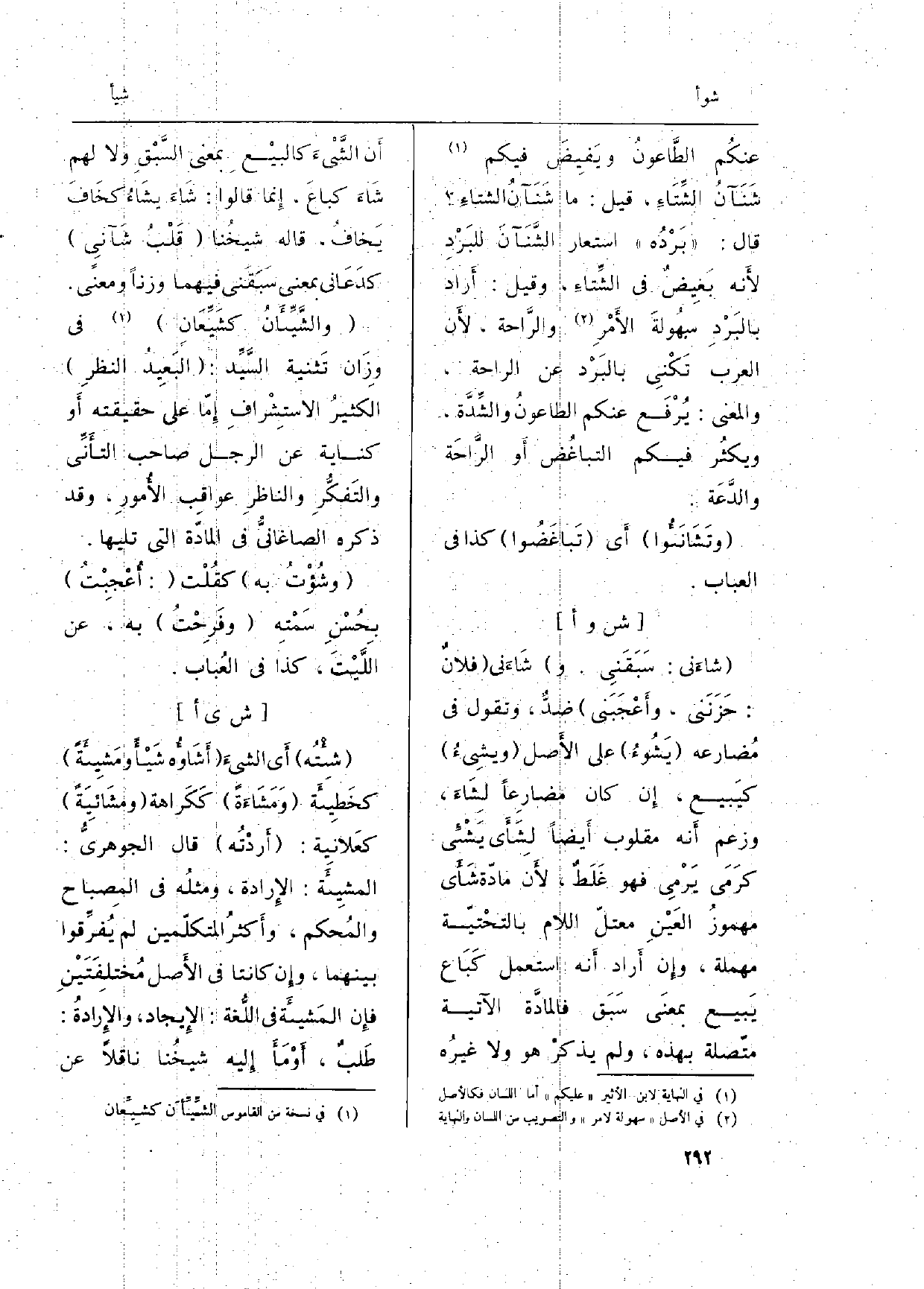 : (} - شاءَني: سَبَقَنِي. و) شَاءَني (فلانٌ: حَزَنَني، وأَعْجَبَني) ضدٌّ، وَتقول فِي مُضارعه ( {يَشُوءُ) على الأَصل (} - ويشِيءُ) كيَبيع، إِن كَانَ مضارِعاً {لِشَاءَ، وَزعم أَنه مقلوب أَيضاً لِشَأَي يَشْئِي كَرَمي يَرْمِي فَهُوَ غَلَظٌ، لأَن مادّة شَأَي مهموزُ العَيْنِ معتلّ اللَّام بالتحْتيّة مُهْملَة، وإِن أَراد أَنه اسْتعْمل كَبَاع يَبيع بمعنَى سَبَق فالمادَّة الْآتِيَة متّصلة بِهَذِهِ، وَلم يذكرْ هُوَ وَلَا غيرُه أَن الشَّيْءَ كالبيْعِ بِمَعْنى السَّبْقِ وَلَا لَهُم شَاءَ كباعَ، إِنما قَالُوا: شَاءَ يشَاءُ كخَافَ يَخافُ، قَالَه شيخُنا (قَلْبُ} - شَآنِي) كدَعَاني بِمَعْنى سَبَقَني فيهمَا وزنا وَمعنى.