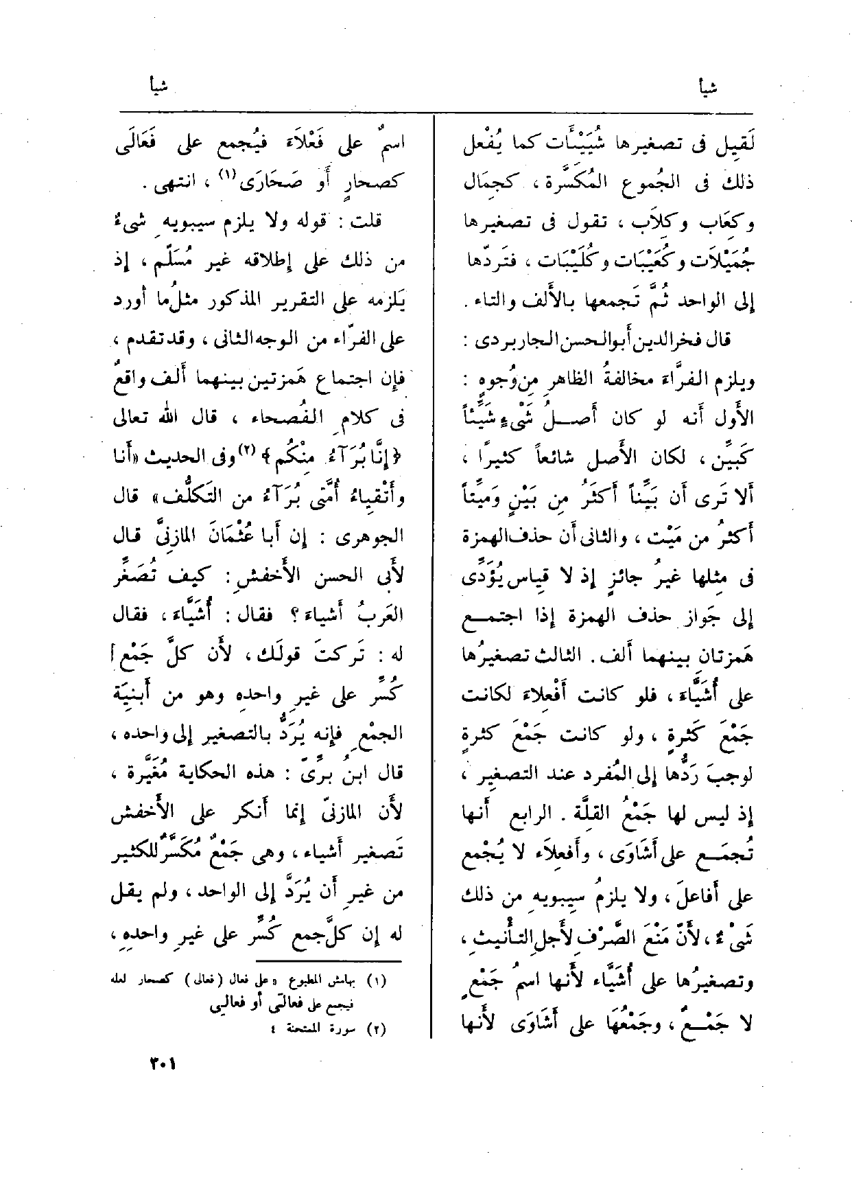 قلت: قَوْله وَلَا يلْزم سيبويهِ شيءٌ من ذَلِك على إِطلاقه غير مُسَلّم، إِذ يَلزمه على التَّقْرِير الْمَذْكُور مثلُ مَا أورد على الفرّاء من الْوَجْه الثَّانِي، وَقد تقدم، فإِن اجْتِمَاع هَمزتين بَينهمَا أَلف واقعٌ فِي كلامِ الفُصحاء، قَالَ الله تَعَالَى {إِنَّا بُرَءآؤاْ مّنْكُمْ} (الممتحنة: 4) وَفِي الحَدِيث: (أَنا وأَتْقِياءُ أُمَّتي بُرَآءُ من التَكلُّفِ) قَالَ الْجَوْهَرِي: إِن أَبا عُثْمَانَ المازنيَّ قَالَ لأَبي الْحسن الأَخفشِ: كَيفَ تُصَغِّر العَربُ أَشياءَ؟ فَقَالَ: أُشَيَّاءَ، فَقَالَ لَهُ: تَركتَ قولَك، لأَن كلَّ جَمْع كُسِّر على غيرِ واحدِه وَهُوَ من أَبنِيَة الجمْعِ فإِنه يُرَدُّ بِالتَّصْغِيرِ إِلى واحده، قَالَ ابنُ برِّيّ: هَذِه الْحِكَايَة مُغَيَّرة، لأَن المازنيّ إِنما أَنكر على الأَخفش تَصغير أَشياء، وَهِي جَمْعٌ مُكَسَّرٌ للكثير من غيرِ أَن يُرَدَّ إِلى الْوَاحِد، وَلم يقل لَهُ ابْن جمع كُسِّر على غيرِ واحدِهِ،