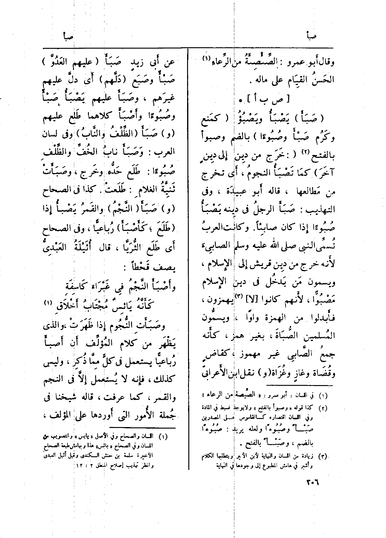 : (} صَبَأَ) {يَصْبَأُ} ويَصْبُؤُ (كمَنع وكَرُم {صَبْأً} وصُبُوءًا) بِالضَّمِّ وصبوأ بِالْفَتْح (: خَرَج من دِين إِلى دِينٍ آخَرَ) كمَا تَصْبَأُ النجومُ، أَي تخرج من مَطالعها، قَالَه أَبو عبيدَة، وَفِي (التَّهْذِيب) : صَبَأَ الرجلُ فِي دِينه يَصْبَأُ صُبُوءًا إِذا كَانَ {صابِئاً. وَكَانَت العربُ تُسمِّي النَّبِي صلى الله عَلَيْهِ وَسلم الصابِيءَ لأَنه خرج من دِين قُرَيْش إِلا الإِسلام، ويسمون مَن يَدخُل فِي دين الإِسلام مَصْبُوًّا، لأَنهم كَانُوا (لَا) يهمزون، فأَبدلوا من الْهمزَة واواً، ويسمُّون المُسلمين} الصُّبَاةَ، بِغَيْر همز، كأَنه جمعُ الصَّابِي غير مَهْمُوز، كقاضٍ وقُضَاة وغازٍ وغُزَاة (و) نقل ابْن الأَعرابيّ عَن أَبي زيدٍ صَبَأَ (عَلَيْهِم العَدُوَّ) صَبْأً وصَبَع (دَلَّهم) أَي دلَّ عَلَيْهِم غيرَهم، {وصَبَأَ عَلَيْهِم يَصْبَأُ صَبْأً وصُبُوءًا وأَصْبَأَ كِلَاهُمَا طَلع عَلَيْهِم (و) صَبَأَ (الظِّلْفُ والنَّابُ) وَفِي (لِسَان الْعَرَب) : وَصَبَأَ نابُ الخُفِّ والظِّلْف} صُبُوءًا: طَلَعَ حَدُّه وخَرج، وصَبَأَتْ ثَنِيَّةُ الغلامِ: طَلَعتْ. كَذَا فِي (الصِّحَاح) (و) صَبَأَ (النَّجْمُ) والقَمرُ يَصْبأُ إِذا (طَلَعَ؛ كَأَصْبَأَ) رُباعيًّا، وَفِي (الصِّحَاح) أَي طَلَع الثُّرَيَّا، قَالَ أُثْيَلَةُ العَبْدِيُّ يصف قَحْطاً: