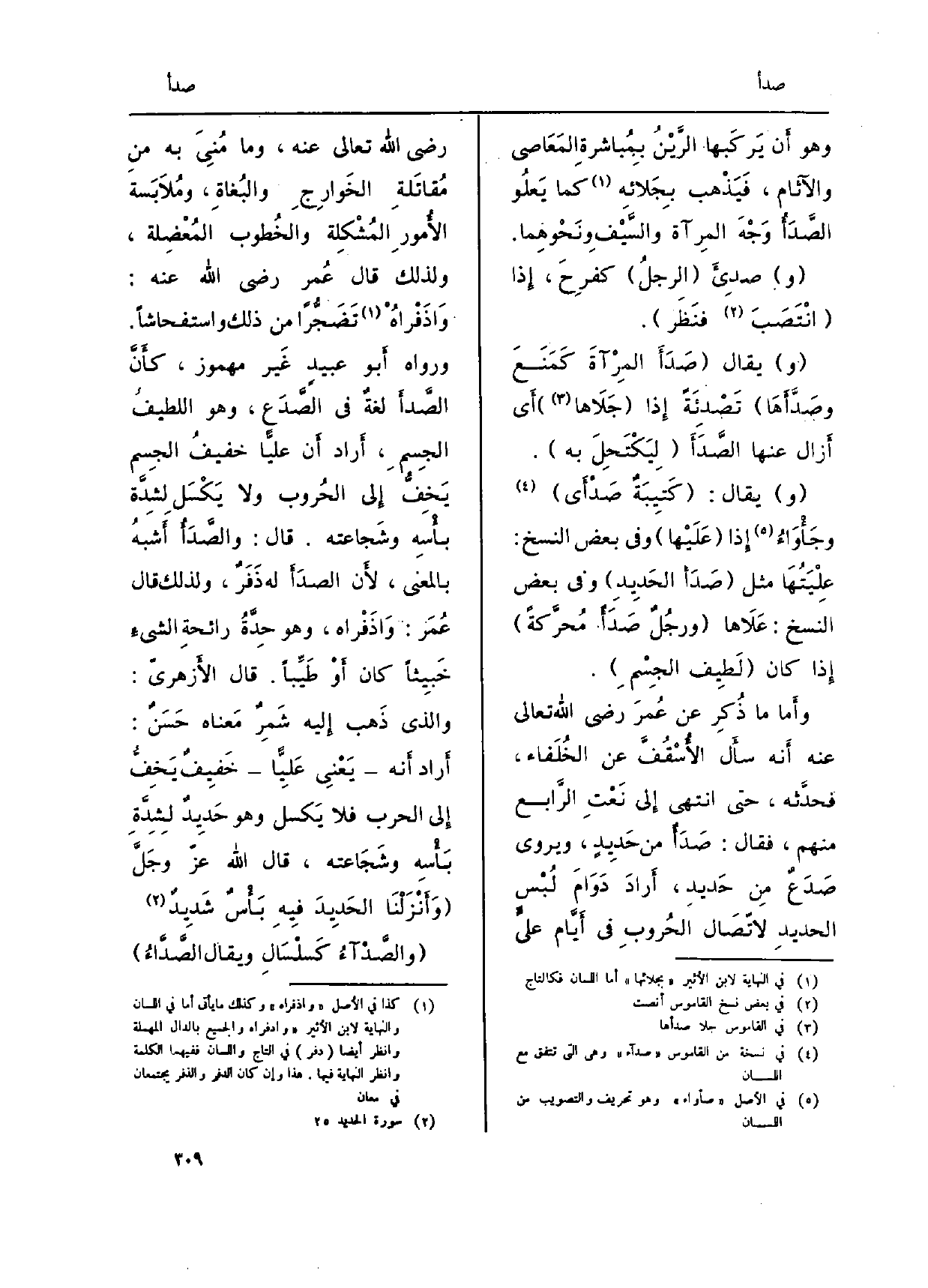 وأَما مَا ذُكِر عَن عُمرَ رَضِي الله تَعَالَى عَنهُ أَنه سأَل الأُسْقُفَّ عَن الخُلَفاء، فحدَّثه، حَتَّى انْتهى إِلى نَعْتِ الرَّابع مِنْهُم، فَقَالَ: صَدَأٌ من حَدِيدٍ، ويروى صَدَعٌ مِن حَديد، أَرادَ دَوَامَ لُبْس الحديدِ لاتّصَال الحُروبِ فِي أَيَّام عليَ رَضِي الله تَعَالَى عَنهُ، وَمَا مُنِيَ بِهِ من مُقاتَلةِ الخَوارِجِ والبُغاةِ، ومُلاَبَسة الأُمورِ المُشْكِلة والخُطوب المُعْضِلة، وَلذَلِك قَالَ عُمر رَضِي الله عَنهُ: وَاذَفْراهُ تَضَجُّراً من ذَلِك واستفحاشاً. وَرَوَاهُ أَبو عبيدِ غَير مَهْمُوز، كأَنَّ الصَّدأَ لغةٌ فِي الصَّدَع، وَهُوَ اللطيفُ الجِسمِ، أَراد أَن عليًّا خفيفُ الجِسم يَخِفُّ إِلى الحُروب وَلَا يَكْسَلِ لشدَّة بأْسِه وشَجاعته. قَالَ: والصَّدَأُ أَشبهُ بِالْمَعْنَى، لأَن الصدَأَ لَهُ ذَفَرٌ، وَلذَلِك قَالَ عُمَر: وَاذَفْراه، وَهُوَ حِدَّةُ رائحةِ الشيءِ خَبيثاً كَانَ أَوْ طَيِّباً. قَالَ الأَزهريّ: وَالَّذِي ذَهب إِليه شَمِرٌ مَعناه حَسَنٌ: أَراد أَنه يَعْنِي عَلِيًّا حَفِيفٌ يَخِفُّ إِلى الْحَرْب فَلَا يَكسل وَهُوَ حَدِيدٌ لِشِدَّةِ بَأْسِه وشَجَاعته، قَالَ الله عزّ وجَلَّ {وَأَنزْلْنَا الْحَدِيدَ فِيهِ بَأْسٌ شَدِيدٌ} (الْحَدِيد: 25) .