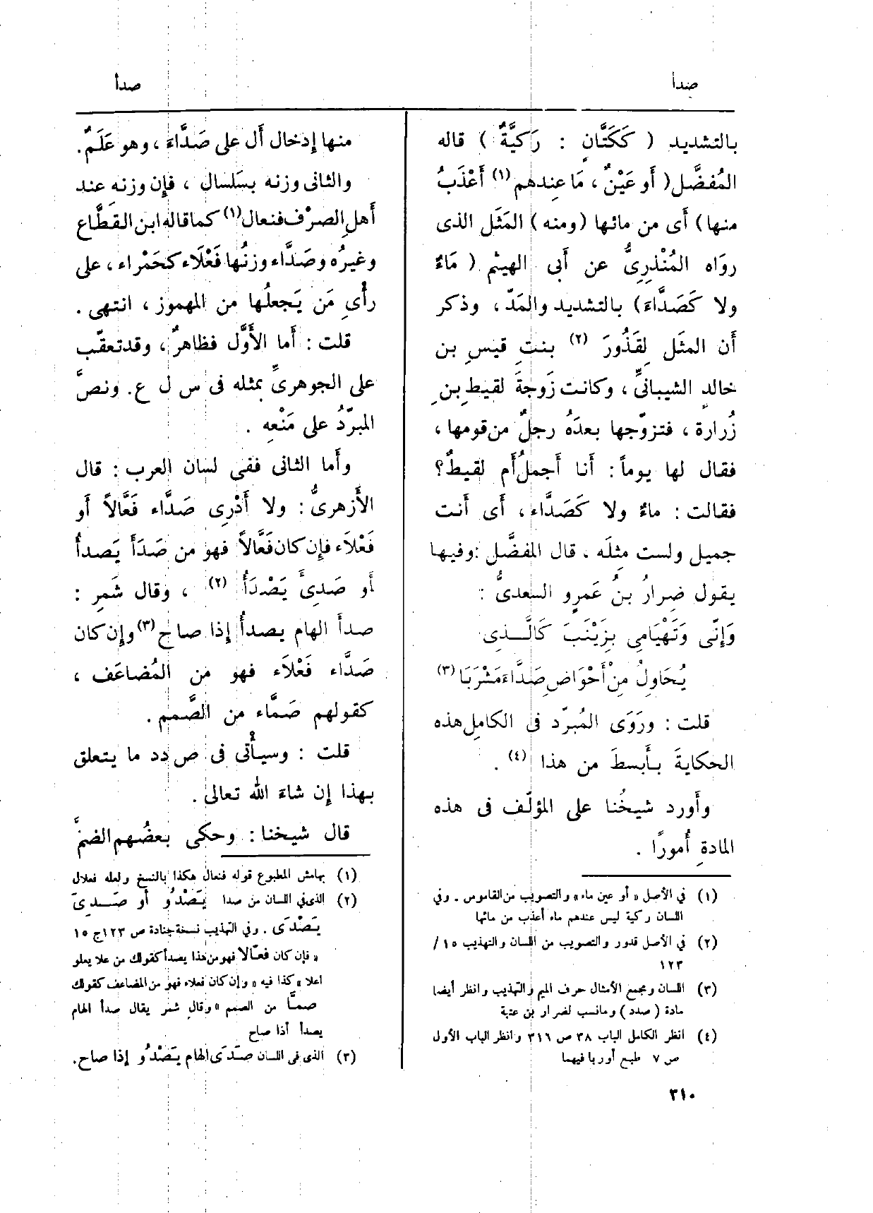 وأَما الثَّانِي فَفِي (لِسَان الْعَرَب) : قَالَ الأَزهريُّ: وَلَا أَدْرِي صَدَّاء فَعَّالاً أَو فَعْلاَء فإِن كَانَ فَعَّالاً فَهُوَ من صَدَأَ يَصدأُ أَو صَدِيءَ يَصْدَأُ، وَقَالَ شَمِر: صدأَ الْهَام يصدأُ إِذا صَاح وإِن كَانَ صَدَّاء فَعْلاَء فَهُوَ من المُضاعَف، كَقَوْلِهِم صَمَّاء من الصَّمم.