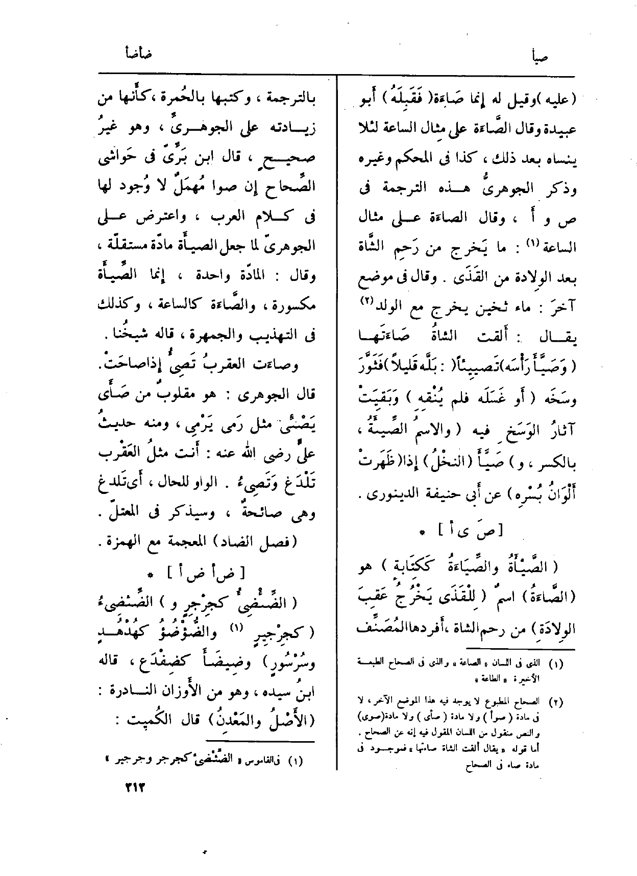 : (} الصَّيْأَةُ {والصِّيَاءَةُ كَكِتَابةٍ) هُوَ (} الصَّاءَةُ) اسمٌ (لِلْقَذَى يَخْرُجُ عَقِبَ الوِلادَةِ) من رحم الشَّاة، أَفردها المُصَنِّف بالترجمة، وكتبها بالحُمرة، كأَنها من زِيَادَته على الجوهريِّ، وَهُوَ غيرُ صحيحٍ، قَالَ ابْن بَرِّيّ فِي (حَواشي الصِّحاح) إِن صوا مُهمَلٌ لَا وُجود لَهَا فِي كَلَام الْعَرَب، وَاعْترض على الجوهريّ لما جعل الصيأَة مادّة مستقلّة، وَقَالَ: المادّة وَاحِدَة، إِنما الصِّيأَة مَكْسُورَة، والصَّاءَة كالساعة، وَكَذَلِكَ فِي (التَّهْذِيب) و (الجمهرة) ، قَالَه شيخُنا.