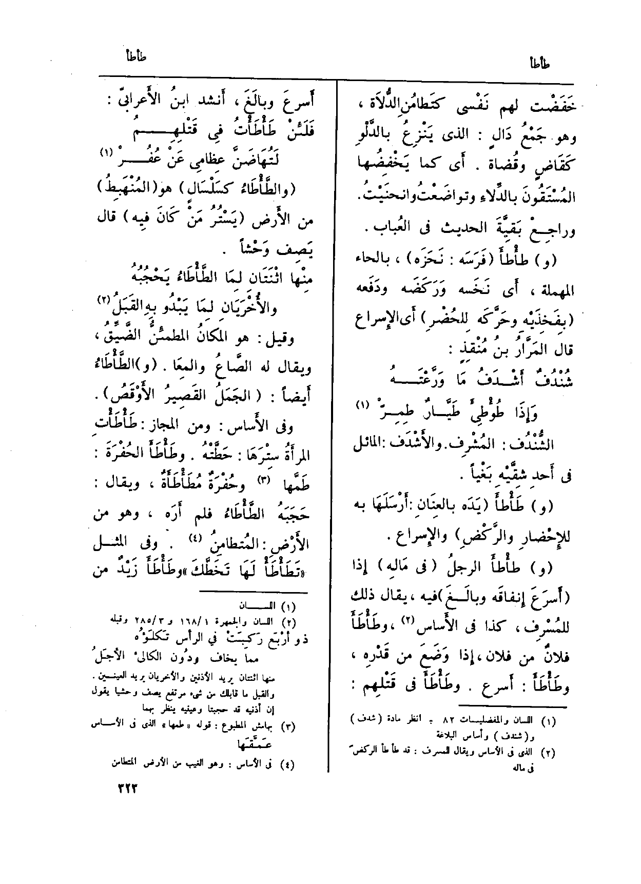 (و) طأْطأَ الرجلُ (فِي مَالِه) إِذا (أَسرَعَ إِنفاقَه وبالَغَ) فِيهِ، يُقَال ذَلِك للمُسْرِف، كَذَا فِي الأَساس، وطَأْطَأَ فلانٌ من فلَان، إِذا وَضَعَ من قَدْرِه، وطَأْطَأَ: أَسرع. وطَأْطَأَ فِي قَتْلِهم: أَسرعَ وبالَغَ، أَنشد ابنُ الأَعرابيّ: