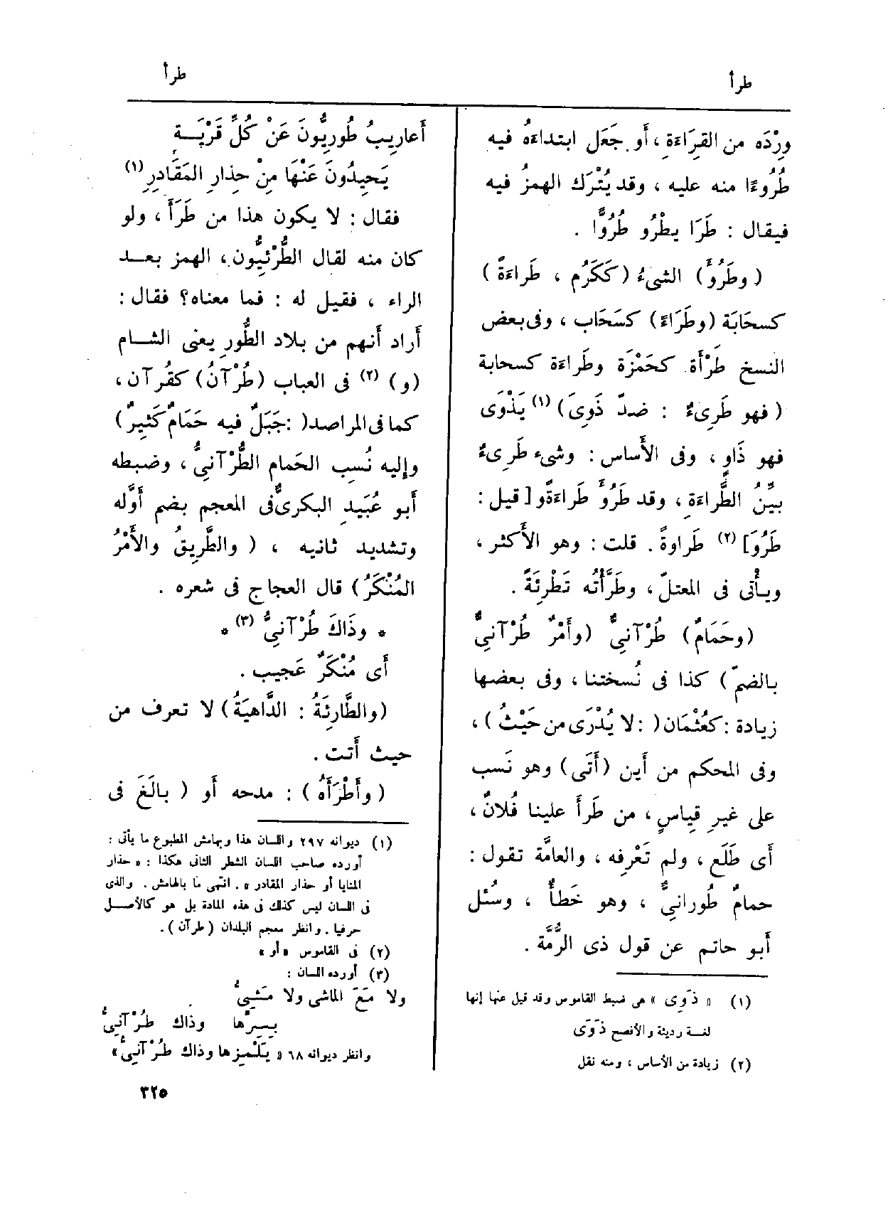 فَقَالَ: لَا يكون هَذَا من طَرَأَ، وَلَو كَانَ مِنْهُ لقَالَ الطُّرْئِيُّون، الْهَمْز بعد الرَّاء، فَقيل لَهُ: فَمَا مَعْنَاهُ؟ فَقَالَ: أَراد أَنهم من بِلَاد الطُّورِ يَعْنِي الشَّام (و) فِي (الْعباب) (طُرْآنُ) كقُرآن، كَمَا فِي (المراصد) (: جَبَلٌ فِيهِ حَمَامٌ كَثيرٌ) وإِليه نُسِب الحَمام الطُّرْآنِيُّ، وَضَبطه أَبو عُبَيدِ البكريٌّ فِي (المعجم) بِضَم أَوَّله وَتَشْديد ثَانِيه، (والطَّرِيقُ والأَمْرُ المُنْكَرُ) قَالَ العجاج فِي شعره: