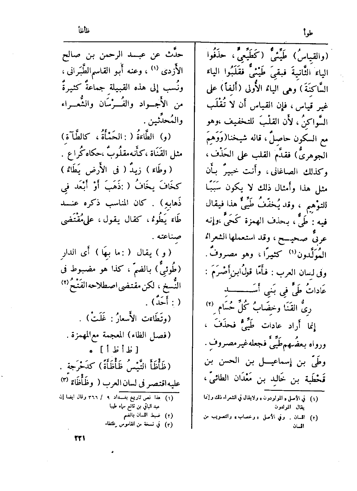 إِنما أَراد عادات طَيِّيءٍ فحذَفَ، وَرَوَاهُ بعضُهم طَيِّيءَ فَجعله غير مصروفِ. وطَيّ بن إِسماعيل بن الْحسن بن قَحْطَبة بن خَالِد بن مَعْدَان الطائيّ، حدَّث عَن عبد الرحمان بن صَالح الأَزدي، وَعنهُ أَبو الْقَاسِم الطَّبَراني، ونُسب إِلى هَذِه القبيلةِ جماعةٌ كثيرةٌ من الأَجواد والفُرْسَان والشُّعراء والمُحدِّثين.