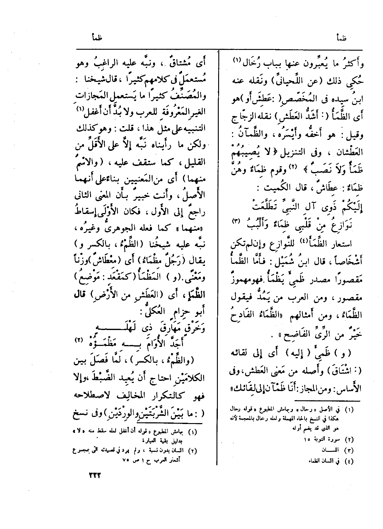 اسْتعَار الظِّمَأَ للنَّوازِع وإِن لم تكن أَشْخَاصاً، قَالَ ابنُ شُمَيْل: فأَمَّا الطَّمأُ مَقصوراً مصدر ظَمِيءَ يَظْمَأُ فَهُوَ مهموزٌ مَقْصُور، وَمن الْعَرَب من يَمُدُّ فَيَقُول الظَّمَاءُ، وَمن أَمثالهم (الظَّمَاءُ الفَادِحُ خَيْرٌ من الرِّيِّ الفَاضِح) .