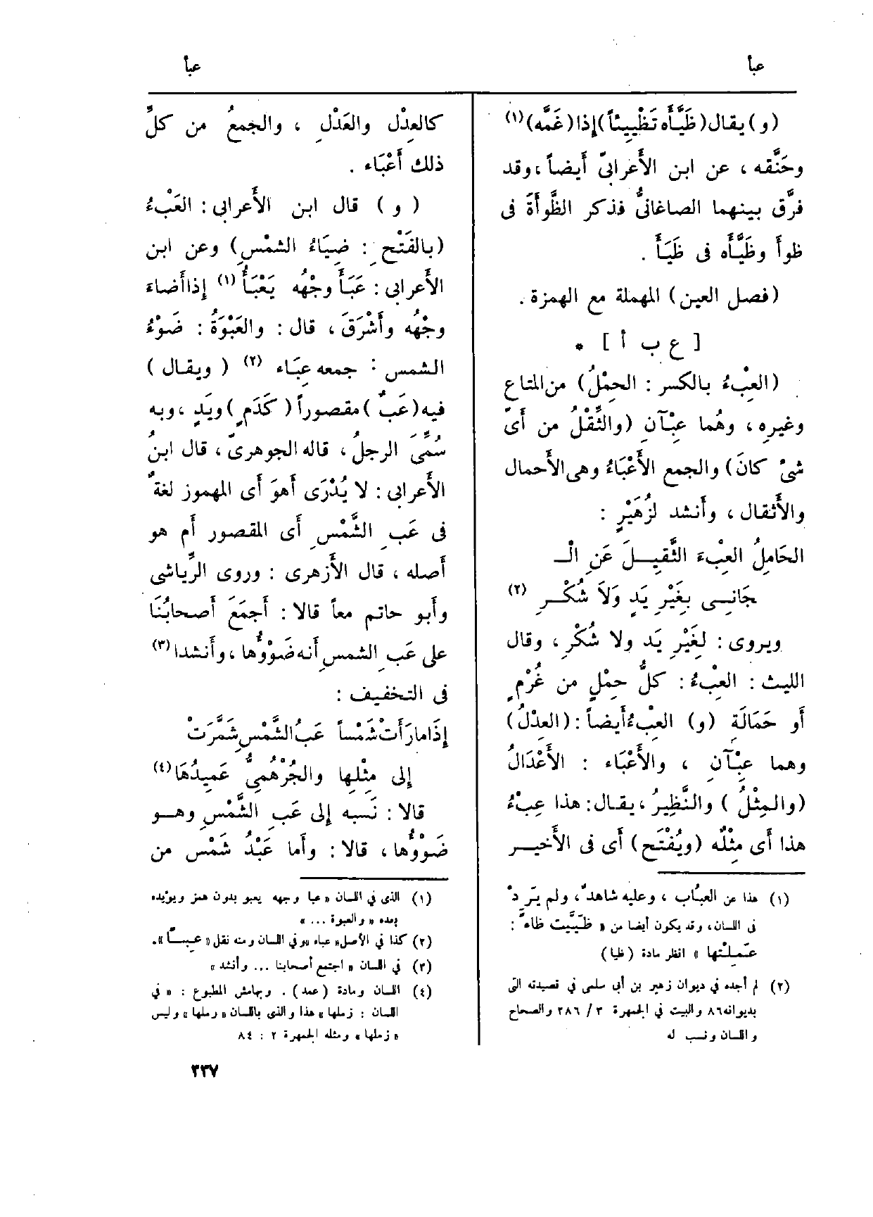 (و) قَالَ ابْن الأَعرابي:} العَبْءُ (بالفَتْحِ: ضِيَاءُ الشمْسِ) وَعَن ابْن الأَعربي: {عَبَأَ وجْهُه} يَعْبَأُ إِذا أَضاءَ وجْهُه وأَشْرَقَ، قَالَ: {والعَبْوَةُ: ضَوْءُ الشَّمْس: جمعه} عِبَاء (وَيُقَال) فِيهِ (! عَبٌ) مَقْصُورا (كَدَمٍ) ويَدٍ، وَبِه سُمِّيَ الرجلُ، قَالَه الجوهريّ، قَالَ ابنُ الأَعرابي: لَا يُدْرَى أَهوَ أَي المهموز لغةٌ فِي عَبِ الشَّمْسِ أَي الْمَقْصُور أَم هُوَ أَصله، قَالَ الأَزهري: وروى الرِّياشي وأَبو حَاتِم مَعًا قَالَا: أَجمَعَ أَصحابُنَا على عَبِ الشمسِ أَنه ضَوْؤُها، وأَنشدا فِي التَّخْفِيف: