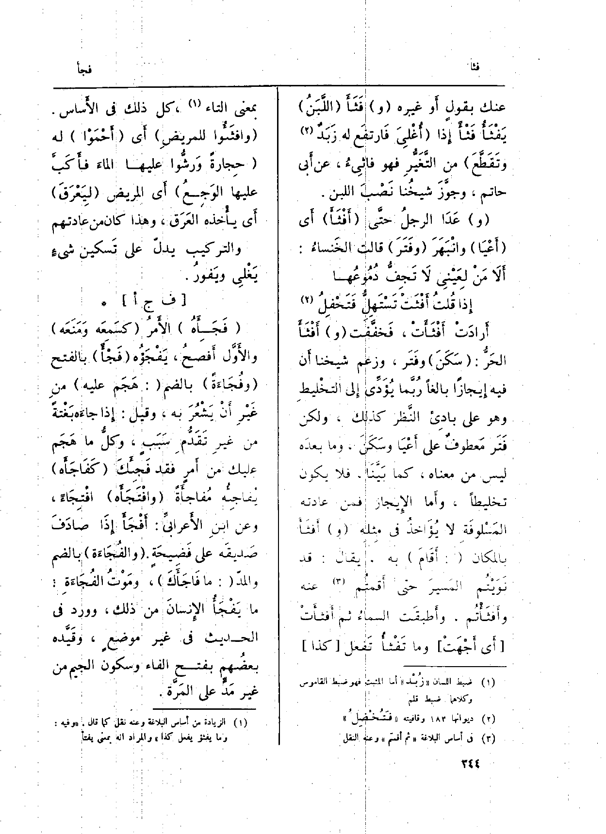 : ( {فَجَأَهُ) الأَمرُ (كسَمِعَه وَمَنَعَه) والأَوَّل أَفصحُ،} يَفْجَؤُه (فَجْأً) بِالْفَتْح ( {وفُجَاءَةً) بِالضَّمِّ (: هَجَم عَلَيْهِ) منِ غَيْرِ أَنْ يَشْعُرَ بِهِ، وَقيل: إِذا جاءَه بَغْتةً من غيرِ تَقَدُّمِ سَبَبٍ، وكلُّ مَا هَجَم عَلَيْك من أَمرٍ فقد فَجِئَكَ (} كَفَاجَأَه) {يُفاجِئُه} مُفاجأَةً ( {وافْتَجَأَه) } افْتِجَاءً، وَعَن ابنِ الأَعرابيِّ: {أَفْجَأَ إِذَا صادَفَ صَديقَه على فَضِيحَةٍ. (} والفُجَاءَة) بِالضَّمِّ والمدُّ (: مَا {فَاجَأَكَ) . ومَوْتُ الفُجَاءَةِ، مَا} يَفْجَأُ الإِنسانَ من ذَلِك، وَورد فِي الحَدِيث فِي غير موضعٍ، وقَيَّده بعضُهم بِفَتْح الْفَاء وَسُكُون الْجِيم من غير مَدَ على المَرَّة.