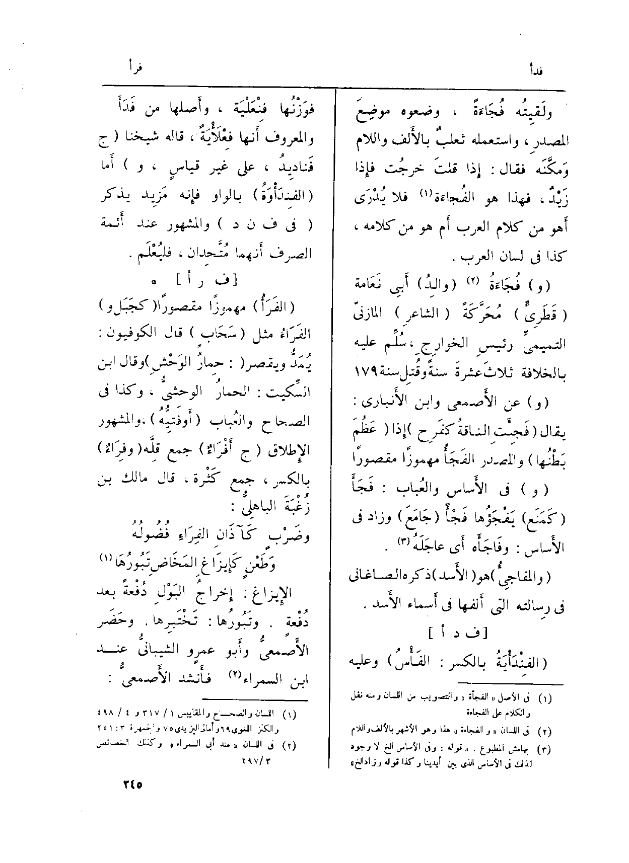 : (} الفَرَأُ) مهموزاً مَقْصُورا (كَجَبَل و) {الفَرَاءُ مثل (سَحَابٍ) قَالَ الْكُوفِيُّونَ: يُمَدُّ وَيقصر (: حِمارُ الوَحْشِ) وَقَالَ ابْن السِّكيت: الحمارُ الوحشيُّ، وَكَذَا فِي (الصِّحَاح) و (العُباب) (أَوفَتِيُّهُ) ، وَالْمَشْهُور الإِطلاق (ج} أَفْرَاءٌ) جمع قِلَّة ( {وفِرَاءٌ) بِالْكَسْرِ، جمع كَثْرة، قَالَ مَالك بن زُغْبَةَ الباهِليُّ: