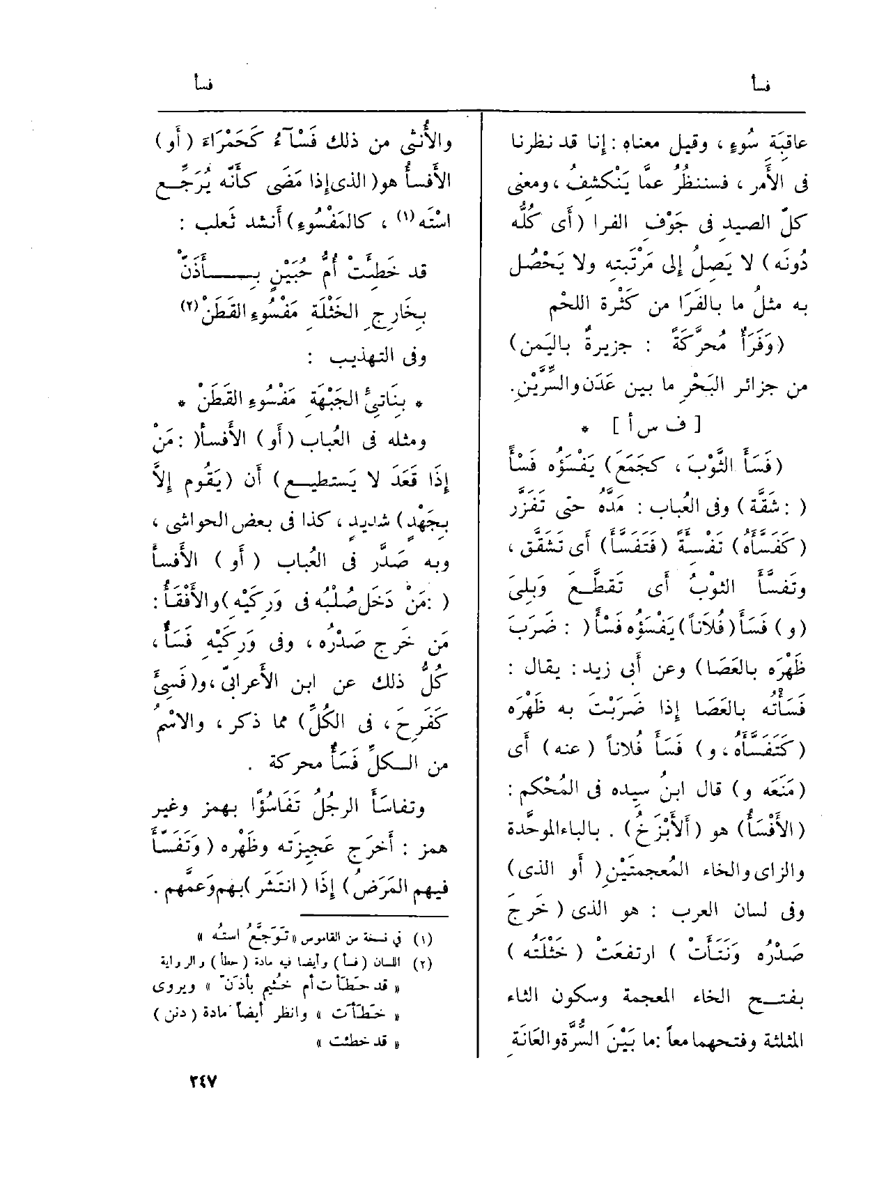 وَمثله فِي (العُباب) (أَو) الأَفسأَ (: مَنْ إِذَا قَعَدَ لَا يَستطيع) أَن (يَقُوم إِلاَّ بِجَهْدٍ) شديدٍ، كَذَا فِي بعض الْحَوَاشِي، وَبِه صَدَّر فِي (العُباب) (أَو) الأَفسأَ (: مَنْ دَخَل صُلْبُه فِي وَرِكَيْهِ) والأَفْقَأُ: مَن خَرج صَدْرُه، وَفِي وَرِكَيْهِ} فَسَأٌ، كُلُّ ذَلِك عَن ابْن الأَعرابيّ، و ( {فَسِىءَ كَفَرِحَ، فِي الكُلِّ) مِمَّا ذكر، والاسْمُ من الكلِّ فَسَأٌ محركة.