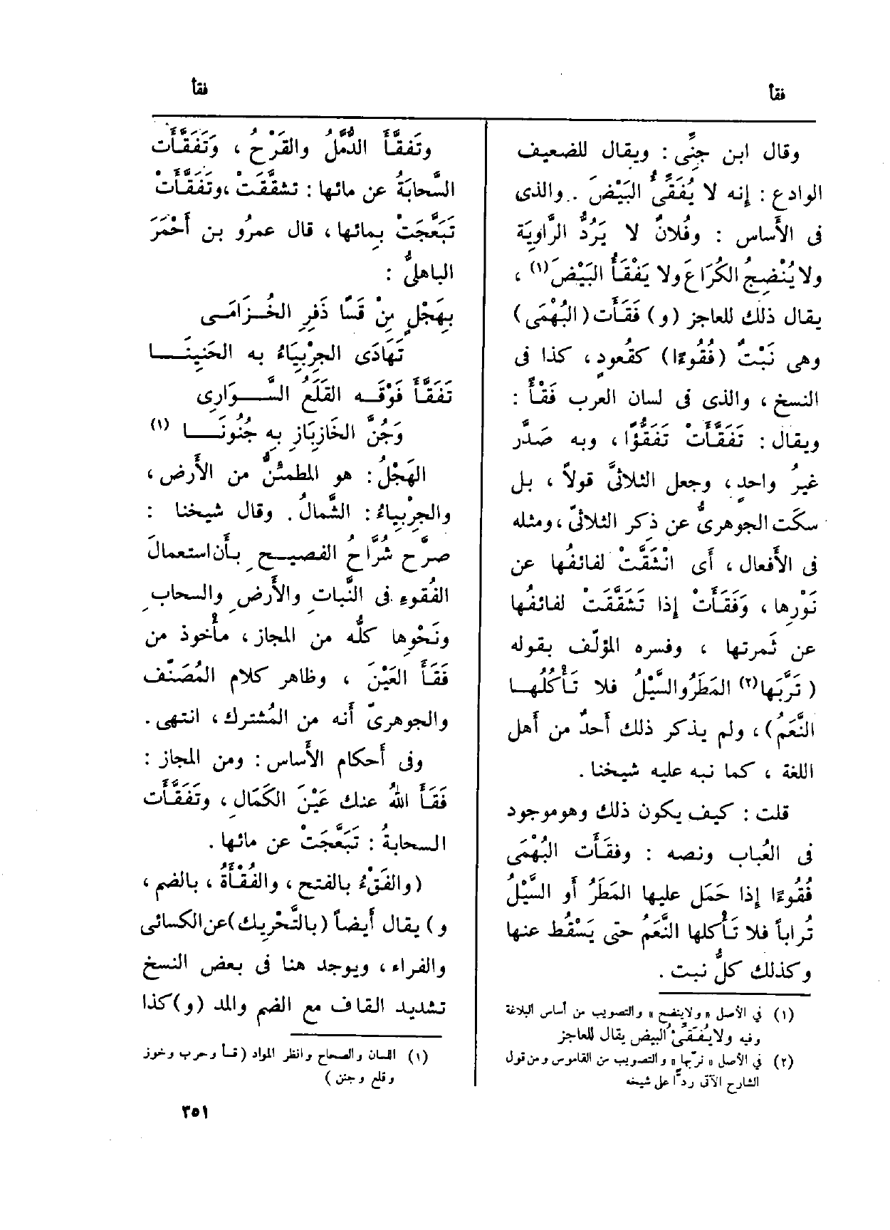 وَقَالَ ابْن جِنِّي: وَيُقَال للضعيف الوادع: إِنه لَا {يُفَقِّىءُ البَيْضَ. وَالَّذِي فِي الأَساس: وفُلانٌ لَا يَرُدُّ الرَّاوِيَة وَلَا يُنْضِجُ الكُرَاعَ وَلَا يَفْقَأُ البَيْضَ، يُقَال ذَلِك للعاجز (و) فَقَأَت (البُهْمَي) وَهِي نَبْتٌ (فُقُوءًا) كقُعودٍ، كَذَا فِي النّسخ، وَالَّذِي فِي (لِسَان الْعَرَب) فَقْأً: وَيُقَال: تَفَقَّأَتْ} تَفَقُّؤاً، وَبِه صَدَّر غيرُ واحدٍ، وَجعل الثلاثيَّ قولا، بل سكَت الجوهريُّ عَن ذكر الثلاثيّ، وَمثله فِي الأَفعال، أَي انحشَقَّتْ لفائفُها عَن نَوْرِها، وَفَقَأَتْ إِذا تَشَقَّقَتْ لفائفُها عَن ثَمرتها، وَفسّر المؤلّف بقوله (تَرَّبَها المَطَرُ والسَّيْلُ فَلَا تَأْكُلُها النَّعَمُّ) ، وَلم يذكر ذَلِك أَحدٌ من أَهل اللُّغَة، كَمَا نبه عَلَيْهِ شَيخنَا.