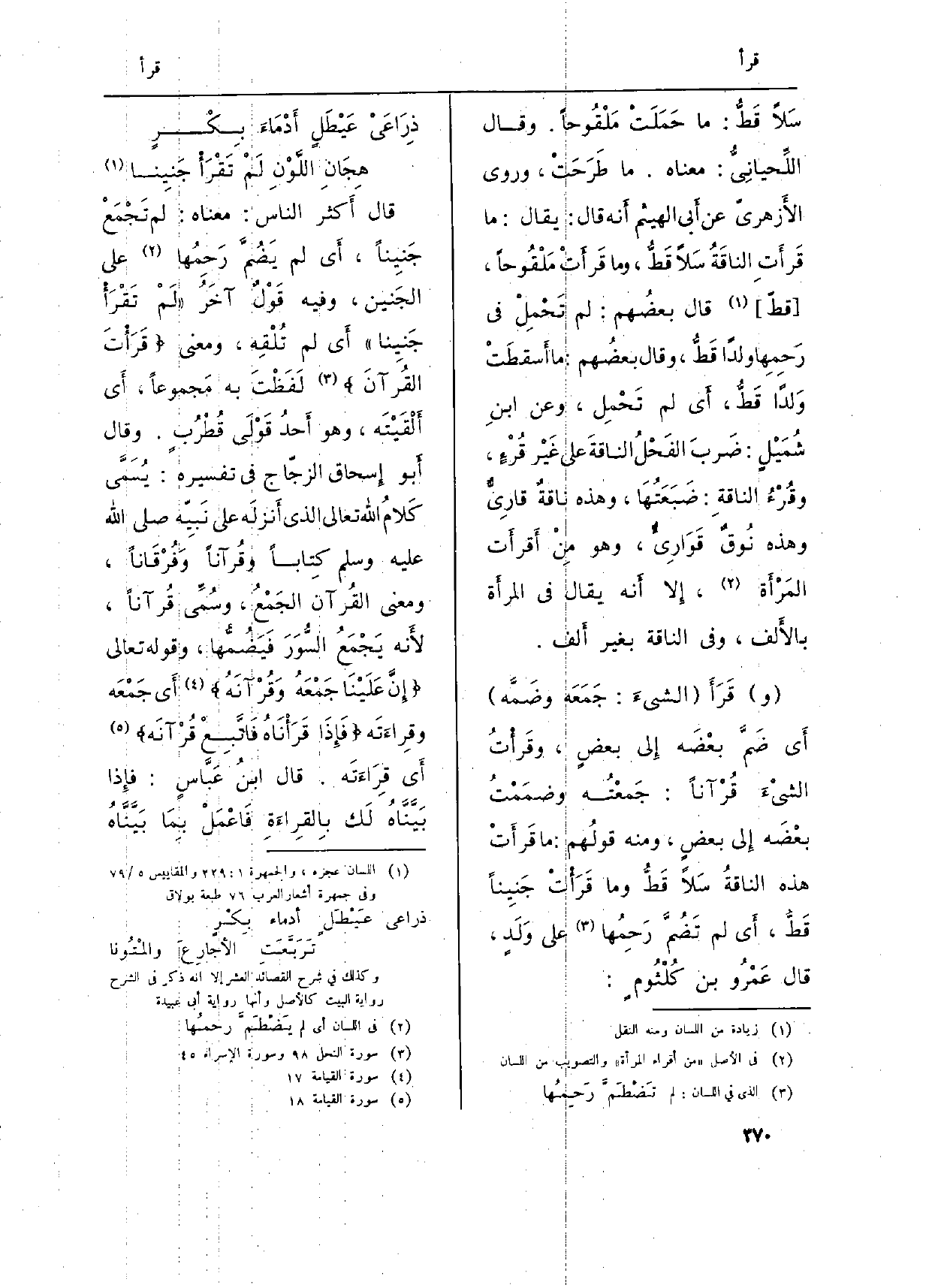 قَالَ أَكثر النَّاس: مَعْنَاهُ: لم تَجْمَعْ جَنِيناً، أَي لم يَضُمَّ رَحِمُها على الجَنين، وَفِيه قَوْلٌ آخَرُ (لَمْ تَقْرَأْ جَنِينا) أَي لم تُلْقِه، وَمعنى {قَرَأْتَ الْقُرْءانَ} (النَّحْل: 98) لَفَظْتَ بِهِ مَجموعاً، أَي أَلْقَيْتَه، وَهُوَ أَحدُ قَوْلَي قُطْرُبٍ. وَقَالَ أَبو إِسحاق الزّجاج فِي تَفْسِيره: يُسَمَّى كَلامُ الله تَعَالَى الَّذِي اينزلَه على نَبِيّه صلى الله عَلَيْهِ وسلمكِتاباً وقُرآناً وفُرْقَاناً، لأَنه يَجْمَعُ السُّوَرَ فَيَضُمُّها، وَقَوله تَعَالَى: {إِنَّ عَلَيْنَا جَمْعَهُ وَقُرْءانَهُ} (الْقِيَامَة: 17) أَي جَمْعَه} وقِراءَتَه {فَإِذَا قَرَأْنَاهُ فَاتَّبِعْ قُرْءانَهُ} (الْقِيَامَة: 18) أَي قِرَاءَتَه. قَالَ ابنُ عَبَّاسٍ: فإِذا بَيَّنَّاهُ لَك! بِالقِراءَةِ فاعْمَلْ بِمَا بَيَّنَّاهُ