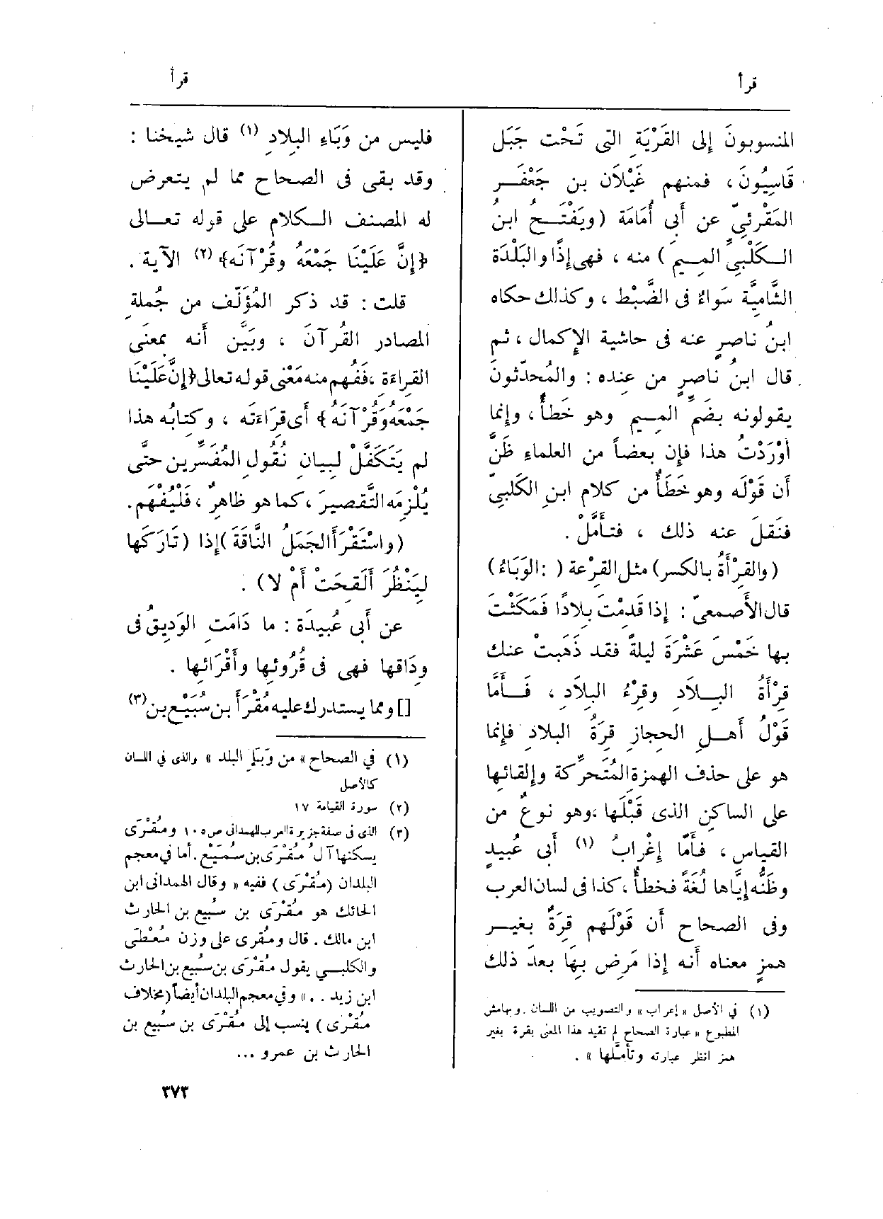 قلت: قد ذكر المُؤَلّف من جُملةِ المصادر القُرآن، وبَيَّن أَنه بمعنَى القِراءَة، فَفُهم مِنْهُ مَعْنى قَوْله تَعَالَى: {إِنَّ عَلَيْنَا جَمْعَهُ وَقُرْءانَهُ} أَي قِرَاءَتَه، وكِتابُه هَذَا لم يَتَكَفَّلْ لِبيانِ نُقُولِ المُفَسِّرين حتَّى يُلْزِمَه التَّقصيرَ، كَمَا هُوَ ظاهِرٌ، فَلْيُفْهَم.