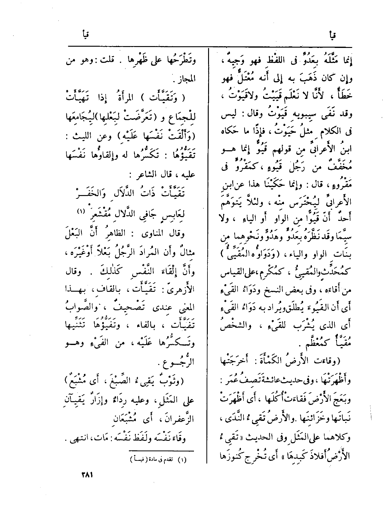 {وقاءَت الأَرضُ الكَمْأَةُ: أَخرَجَتْها وأَظْهَرَتْهَا، وَفِي حَدِيث عائشةَ تَصِفُ عُمَر: وبَعَجَ الأَرْضَ فَقاءَتْ أُكُلَها، أَي أَظْهَرَتْ نَباتَها وخَزَائِنَها. والأَرضُ} - تَقِيءُ النَّدَى، وَكِلَاهُمَا على المَثَلِ وَفِي الحَدِيث (تَقِيءُ الأَرْضُ أَفلاذَ كَبِدِهَا) أَي تُخْرِج كُنوزَها وتَطْرَحُها على ظَهْرِها. قلت: وَهُوَ من الْمجَاز.