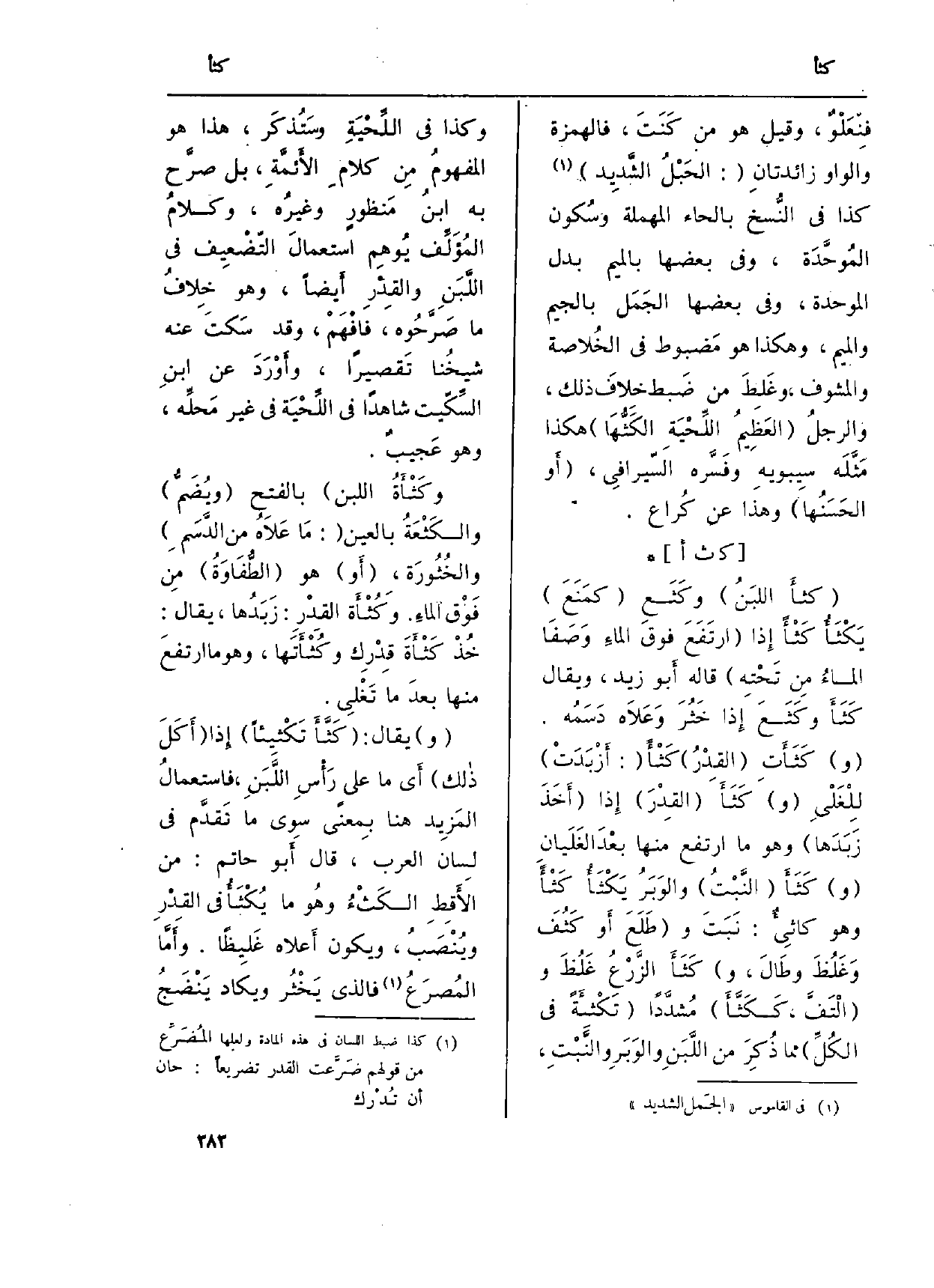 : ( {كثأَ اللبَنُ) وكَثَعِ (كمَنَعَ) } يَكْثَأُ {كَثْأً إِذا (ارتَفَعَ فوقَ الماءِ وَصَفَا الماءُ من تَحْتِه) قَالَه أَبو زيد، وَيُقَال كَثَأَ وكَثَعَ إِذا خَثُرَ وَعَلاَه دَسَمُه. (و) } كَثَأَتِ (القِدْرُ) كَثْأً (: أَزْبَدَتْ) لِلْغَلْي (و) كَثَأَ (القِدْرَ) إِذا (أَخَذَ زَبَدَها) وَهُوَ مَا ارْتَفع مِنْهَا بعْدَ الغَلَيانِ (و) كَثَأَ (النَّبْتُ) والوَبَرُ يَكحثَأُ كَثْأً وَهُوَ {كاثِىءٌ: نَبَتَ و (طَلَعَ أَو كَثُفَ وَغَلُظَ وطَالَ، و) كَثَأَ الزَّرْعُ غَلُظَ و (الْتَفَّ،} كَكَثَّأَ) مُشدَّداً ( {تَكْثِئَةً فِي الكُلِّ) مِمَّا ذِكِرَ من اللَّبَنِ والوَبَرِ والنَّبْتِ، وَكَذَا فِي اللِّحْيَةِ وسَتُذكَر، هَذَا هُوَ المفهومُ مِن كلامِ الأَئمَّةِ، بل صرَّح بِهِ ابنُ مَنظورٍ وغيرُه، وكلامُ المُؤَلِّف يُوهِم استعمالَ التّضْعِيف فِي اللَّبَنِ والقِدْرِ أَيضاً، وَهُوَ خِلافُ مَا صَرَّحُوه، فافْهَمْ، وَقد سَكتَ عَنهُ شيخُنا تَقصيراً، وأَوْرَدَ عَن ابنِ السِّكّيت شَاهدا فِي اللِّحْيَة فِي غير مَحلِّه، وَهُوَ عَجيبٌ.