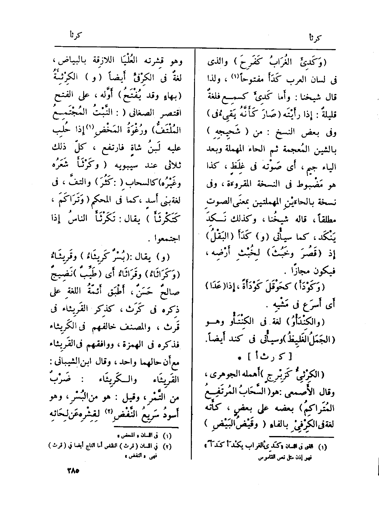 : ( {الكِرْثِىءُ كَزِبْرِجٍ) أَهمله الْجَوْهَرِي، وَقَالَ الأَصمعي: هُوَ (السَّحَابُ المُرتَفِعُ المُتَراكِمُ) بعضه على بعضٍ، كأَنه لُغَة فِي الكِرْفِيءِ بالفاءِ (وقَيْضُ البَيْضِ) وَهُوَ قِشرته العُلْيَا اللازِقة بالبياض، لغةٌ فلي الكِرْفيءِ أَيضاً (و) } الكِرْثِئَةُ (بهاءٍ وَقد يُفْتَحُ) أَوَّله، على الْفَتْح اقْتصر الصغاني (: النَّبْتُ المُجْتَمِعُ المُلْتَفُّ) ورُغْوَةُ المَخْص إِذا حُلِب عَلَيْهِ لَبنُ شاةٍ فارتفع، كلّ ذَلِك ثلاثي عِنْد سِيبَوَيْهٍ ( {وكَرْثَأَ شَعَرُه وغَيْرُه) كالسحابِ (: كَثُرَ) والتفَّ، فِي لُغَة بني أَسدٍ، كَمَا فِي (الْمُحكم) (وَتَرَاكَمَ،} كَتَكرْثَأَ) يُقَال: {تَكَرْثَأَ الناسُ إِذا اجْتَمعُوا.