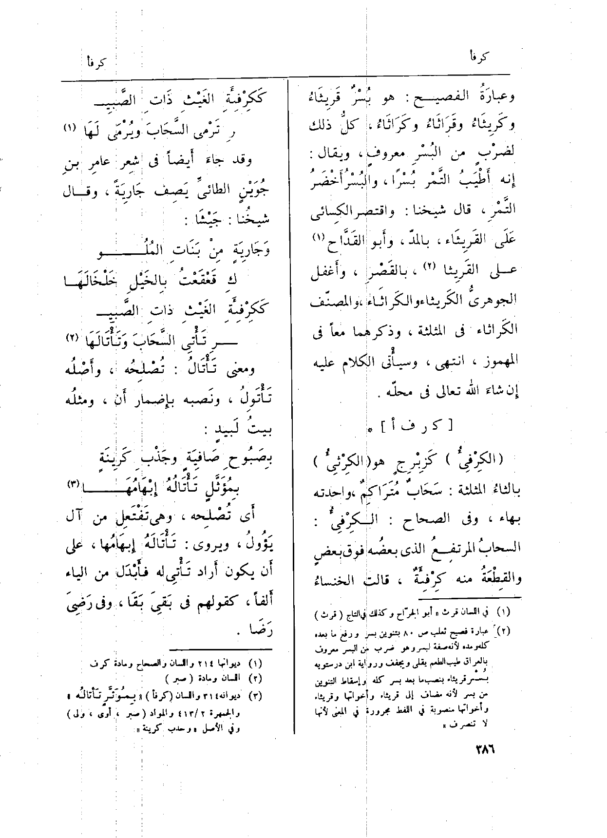 : (} الكِرْفِىءُ) كَزِبْرِجٍ هُوَ (الكِرْثِيءُ) بالثاءُ الْمُثَلَّثَة: سَحَابٌ مُتَرَاكِمٌ، واحدته بهاء، وَفِي (الصِّحَاح) : {الكرْفِىءُ: السحابُ المرتفعُ الَّذِي بعضُه فَوق بعضٍ والقِطْعَةُ مِنْهُ} كِرْفِئَةٌ، قَالَت الخنساءُ: