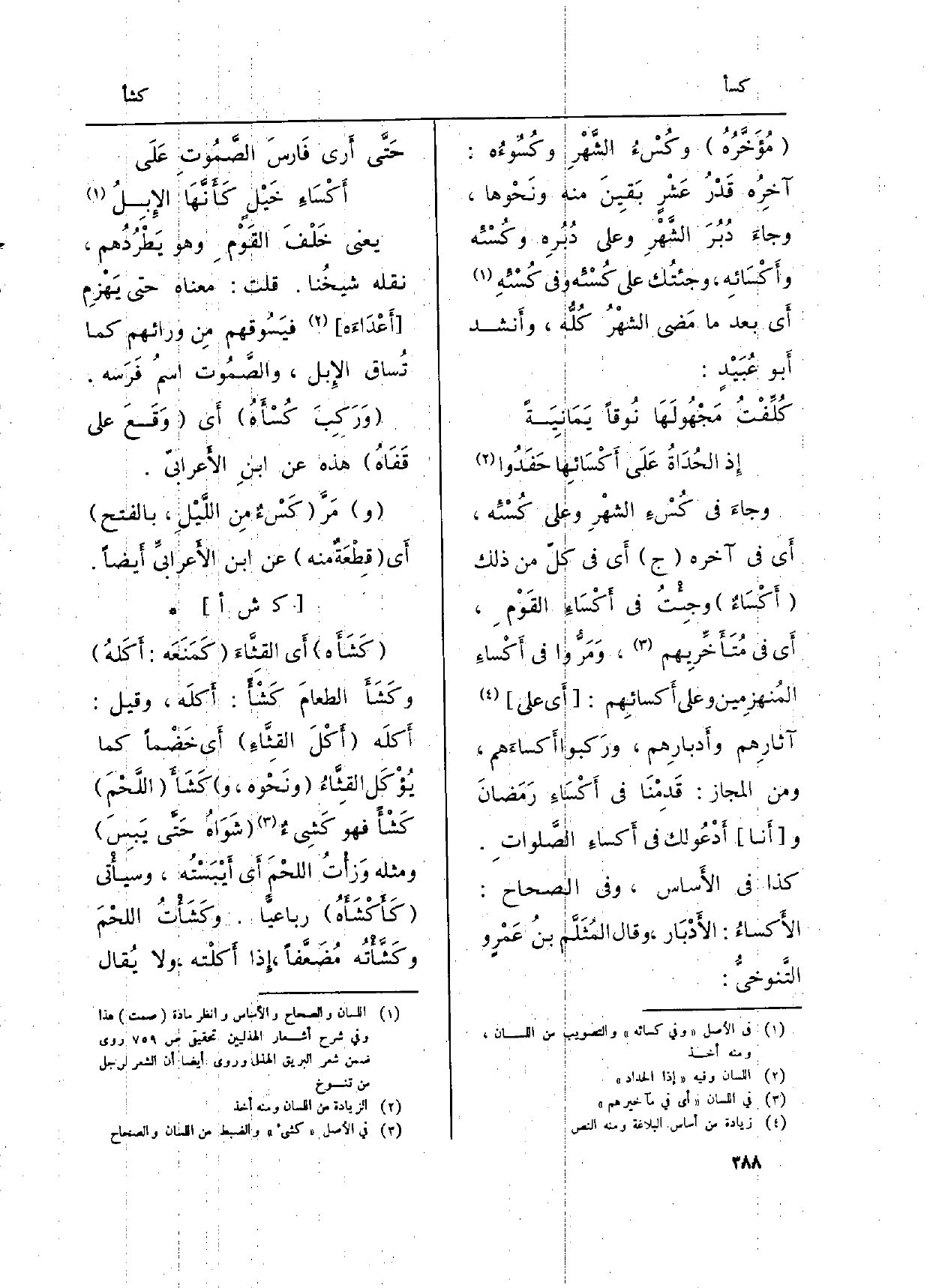 وجاءَ فِي} كُسْءِ الشهْرِ وعَلى {كُسْئِه، أَي فِي آخِره (ج) أَي فِي كلّ من ذَلِك (} أَكْسَاءٌ) وجِئْتُ فِي أَكْسَاءِ القَوْمِ، أَي فِي مُتَأَخِّرِيهم، وَمَرُّوا فِي {أَكْساءِ المُنهزِمين وعَلى أَكسائِهم: (أَي على) آثَارهم وأَدبارِهم، ورَكبوا} أَكساءَهم، وَمن الْمجَاز: قَدِمْنَا فِي أَكْسَاءِ رَمَضانَ و (أَنا) أَدْعُو لَك فِي أَكساءِ الصَّلواتِ. كَذَا فِي (الأَساس) ، وَفِي (الصِّحَاح) : الأَكساءُ: الأَدْبَار، وَقَالَ المُثَلَّم بنُ عَمْرو التَّنوخيُّ: