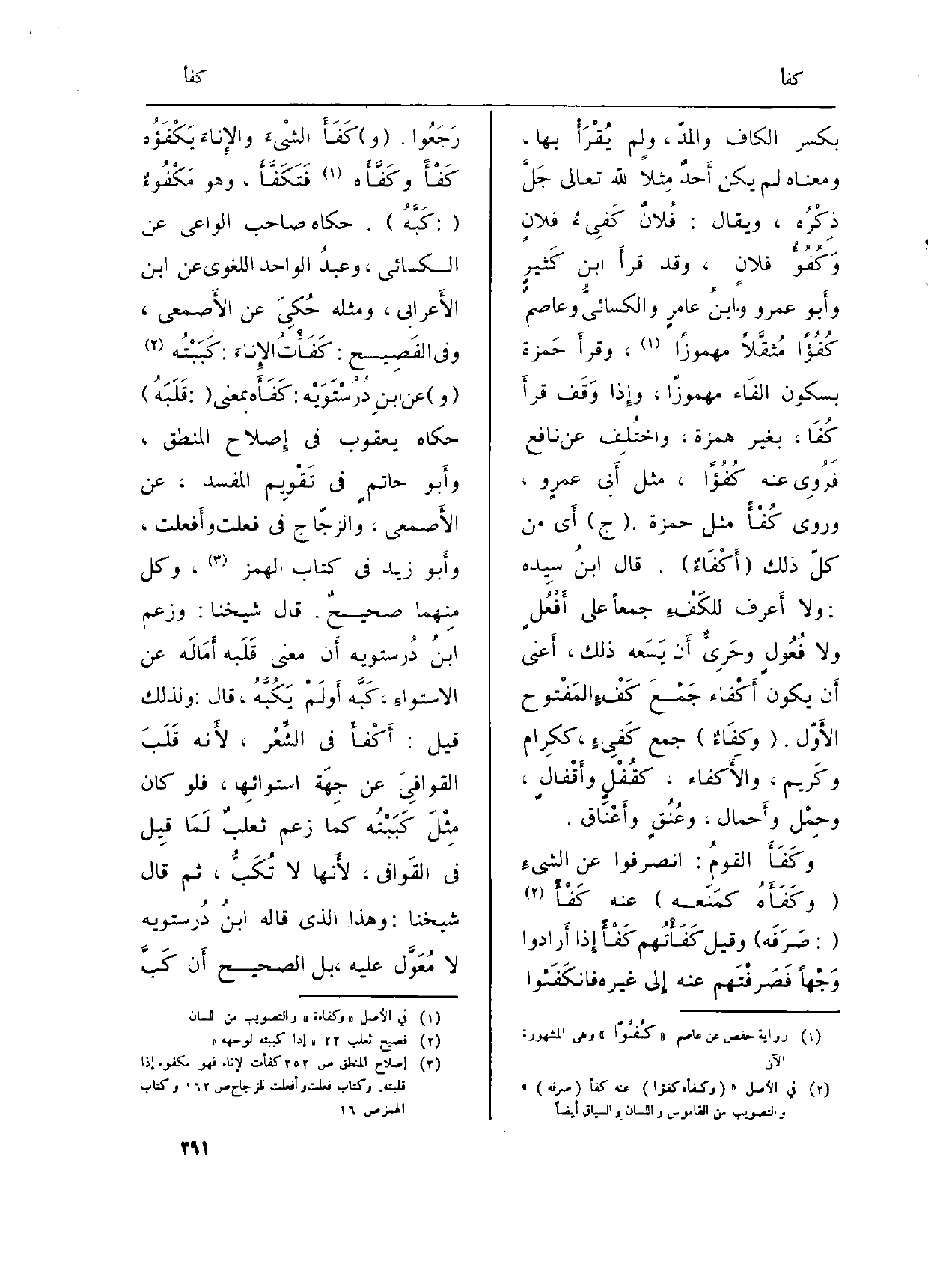 {وكَفَأَ القومُ: انصرفوا عَن الشيءِ (} وكَفَأَهُ كمَنَعَه) عَنهُ كَفْأً (: صَرَفَه) وَقيل {كَفَأْتُهم كَفْأً إِذا أَرادوا وَجْهاً فَصَرفْتَهم عَنهُ إِلى غَيره} فانكَفَئوا رَجَعُوا. (و) كَفَأَ الشْيءَ والإِناءَ {يَكْفَؤُه كَفْأً} وكَفَّأَه {فَتَكَفَّأَ، وَهُوَ} مَكْفُوءٌ (: كَبَّهُ) . حَكَاهُ صَاحب الواعي عَن الْكسَائي، وعبدُ الْوَاحِد اللّغَوِيّ عَن ابْن الأَعرابي، وَمثله حُكِيَ عَن الأَصمعي، وَفِي الفَصيح: {كَفَأْتُ الإِناءَ: كَبَبْتُه (و) عَن ابنِ دُرُسْتَوَيْه:} كَفَأَه بِمَعْنى (: قَلَبَهُ) حَكَاهُ يَعْقُوب فِي إِصلاح الْمنطق، وأَبو حاتمٍ فِي تَقْوِيم الْمُفْسد، عَن الأَصمعي، والزجّاج فِي فعلت وأَفعلت، وأَبو زيد فِي كتاب الْهَمْز، وكل مِنهما صحيحٌ. قَالَ شَيخنَا: وَزعم ابنُ دُرستويه أَن معنى قَلَبه أَمَالَه عَن الاستواءِ، كَبَّه أَو لَمْ يَكُبَّهُ، قَالَ: وَلذَلِك قيل:! أَكْفأَ فِي الشِّعْر، لأَنه قَلَبَ القوافِيَ عَن جِهَة استوائِها، فَلَو كَانَ مِثْلَ كَبَبْتُه كَمَا زعم ثعلبٌ لَمَا قِيل فِي القَوافي، لأَنها لَا تُكَبُّ، ثمَّ قَالَ شَيخنَا: وَهَذَا الَّذِي قَالَه ابنُ دُرستويه لَا مُعَوَّل عَلَيْهِ، بل الصَّحِيح أَن كَبَّ