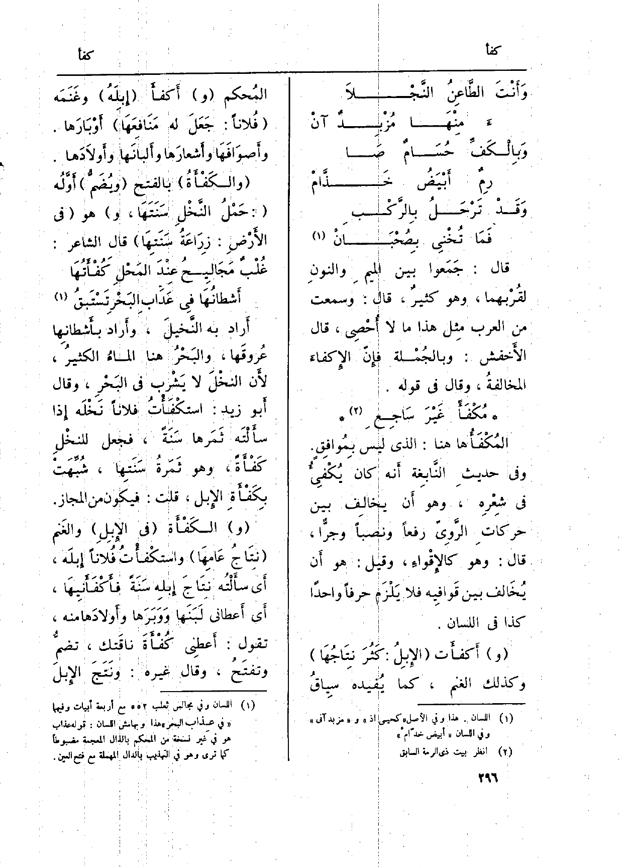 (و) الكَفْأَة (فِي الإِبِلِ) والغَنم (نِتاجُ عَامِهَا) } واستكْفأْتُ فُلاناً إِبلَه، أَي سأَلْتُه نِتَاجَ إِبلهِ سَنَةً! فأَكْفَأَنِيهَا، أَي أَعطاني لَبَنَها وَوَبَرَها وأَولادَها مِنْهُ، تَقول: أَعطِني كُفْأَةَ ناقَتك، تضمُّ وتفتَحُ، وَقَالَ غَيره: ونَتَجَ الإِبلَ