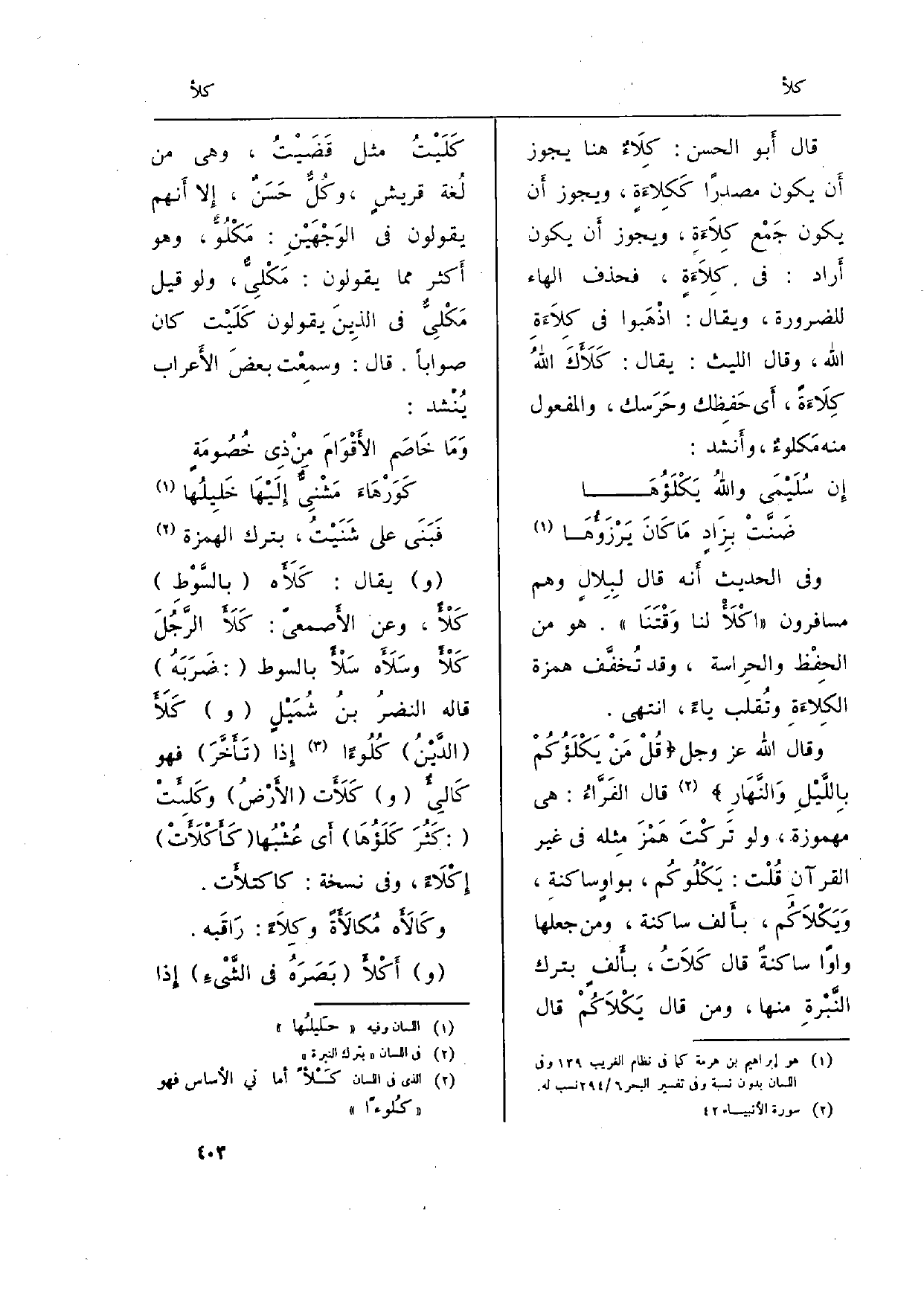 وَقَالَ الله عز وَجل: {قُلْ مَن} يَكْلَؤُكُم بِالَّيْلِ وَالنَّهَارِ} (الْأَنْبِيَاء: 42) قَالَ الفَرَّاء: هِيَ مَهْمُوزَة، وَلَو تَركْتَ هَمْزَ مِثله فِي غير الْقُرْآن قُلْت: يَكْلُوكُم، بواوٍ ساكنةِ، وَيَكْلاَكُم، بأَلف سَاكِنة، وَمن جعلهَا واواً سَاكِنة قَالَ كَلاَتُ، بأَلفٍ بترك النَّبْرةِ مِنْهَا، وَمن قَالَ {يَكْلاَكُمْ قَالَ كَلَيْبُ مثل قَضَيْتُ، وَهِي من لُغة قريشٍ، وكُلٌّ حَسَنٌ، إِلا أَنهم يَقُولُونَ فِي الوَجْهَيْنِ: مَكْلُوٌّ، وَهُوَ أَكثر مِمَّا يَقُولُونَ: مَكْلِيٌّ، وَلَو قيل مَكْلِيٌّ فِي الذِينَ يَقُولُونَ كَلَيْت كَانَ صَوَابا. قَالَ: وسمِعْت بعضَ الأَعراب يُنْشد: