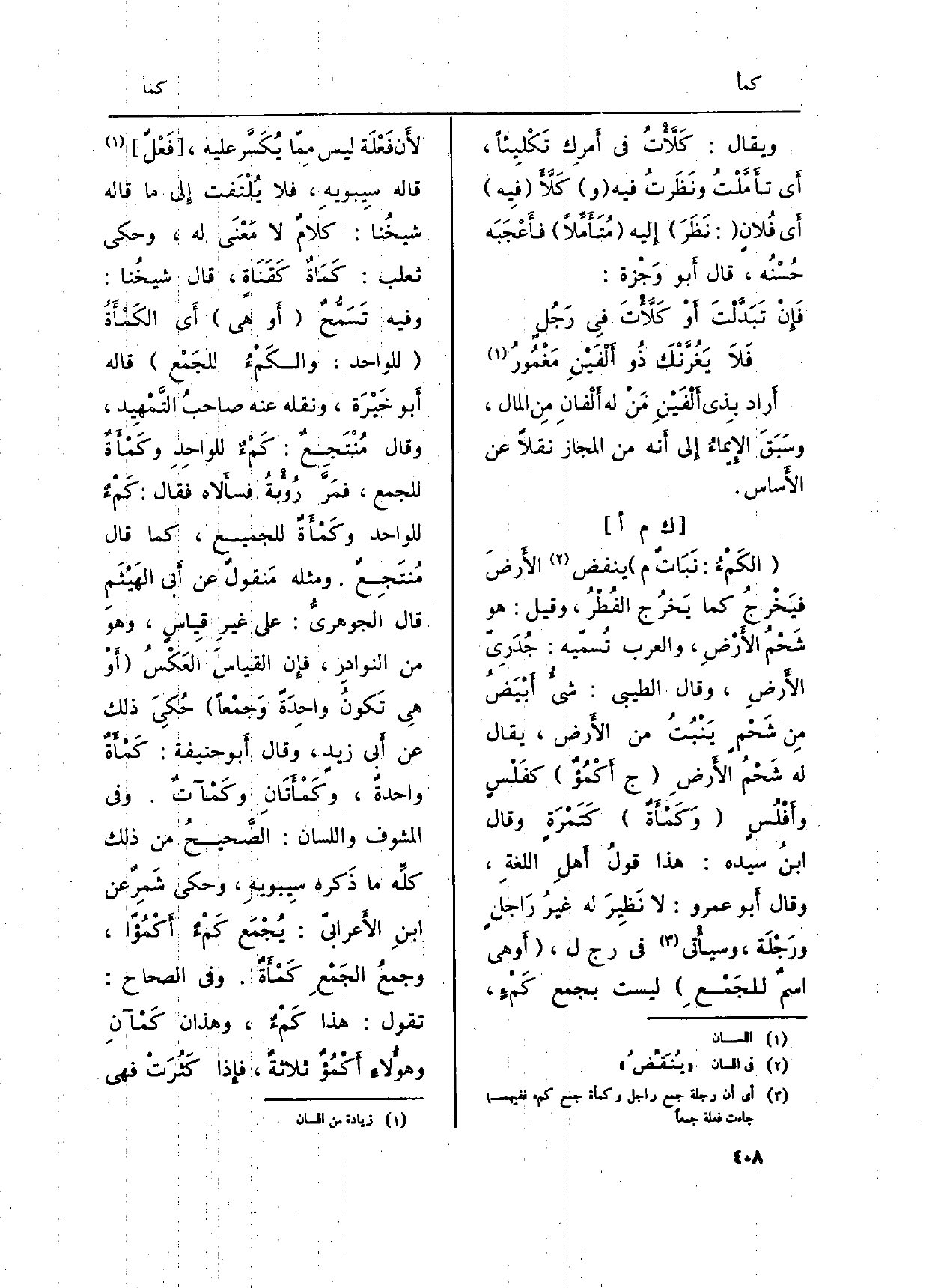 : (} الكَمْءُ: نَبَاتٌ م) ينفض الأَرضَ فيَخْرجُ كَمَا يَخرُج الفُطْرُ، وَقيل: هُوَ شَحْمُ الأَرْضِ، وَالْعرب تُسمّيه: جُدَرِيّ الأَرضِ، وَقَالَ الطَّيِّبِيّ: شيءُ أَبْيَضُ مِن شَحْمٍ يَنْبُتُ من الأَرض، يُقَال لَهُ شَحْمُ الأَرضِ (ج {أَكْمُؤٌ) كفَلْسٍ وأَفْلَسٍ (} وَكَمْأَةٌ) كَتَمْرَةٍ وَقَالَ ابنُ سَيّده: هَذَا قولُ أَهلِ اللغةِ، وَقَالَ أَبو عَمْرو: لَا نَظِيرَ لَهُ غيرُ رَاجلٍ ورَجْلَة، وسيأْتي فِي ر ج ل، (أَو هِيَ اسمٌ للجَمْعِ) لَيست بِجمع {كَمْءٍ، لأَن فَعْلَه لَيْسَ مِمّا يُكَسَّر عَلَيْهِ، (فَعْلٌ) قَالَه سِيبويهِ، فَلَا يُلْتَفت إِلى مَا قَالَه شيخُنا: كلامٌ لَا مَعْنَى لَهُ، وَحكى ثَعْلَب: كَمَاةٌ كَقَنَاةٍ، قَالَ شيخُنا: وَفِيه تَسَمُّحٌ (أَو هِيَ) أَي} الكَمْأَةُ (للْوَاحِد، {والكَمْءُ للجَمْع) قَالَه أَبو خَيْرَة، وَنَقله عَنهُ صاحبُ (التَّمْهِيد) ، وَقَالَ مُنْتَجِعٌ: كَمْءٌ للواحِدِ} وكَمْأَةٌ للْجمع، فمَرَّ رُؤْبةُ فسأَلاه فَقَالَ: كَمْءٌ للْوَاحِد وكَمْأَةٌ للْجَمِيع، كَمَا قَالَ مُنتَجِعٌ. وَمثله مَنقولٌ عناءَبي الهَيْثَمِ قَالَ الجوهريُّ: على غيرِ قِياسٍ، وهوَ من (النَوادِر) ، فإِن القياسَ العَكْسُ (أَوْ هِي تَكونُ واحِدَةً وَجمْعاً) حُكِيَ ذَلِك عَن أَبي زيدٍ، وَقَالَ أَبو حنيفَة: كَمْأَةٌ واحدةٌ، {وكَمْأَتَانِ} وكَمْآتٌ. وَفِي (المشوف) و (اللِّسَان) : الصَّحيحُ من ذَلِك كلِّه مَا ذَكره سِيبويهِ، وَحكى شَمِرٌ عَن ابنِ الأَعرابيّ: يُجْمَع كَمْءٌ {أَكْمُؤاً، وجمعُ الجَمْعِ كَمْأَةٌ. وَفِي (الصِّحَاح) : تَقول: هَذَا كَمْءٌ، وَهَذَانِ} كَمْآنِ وهؤُلاءِ أَكْمُؤٌ ثلاثةٌ، فإِذا كَثُرَتْ فَهِيَ