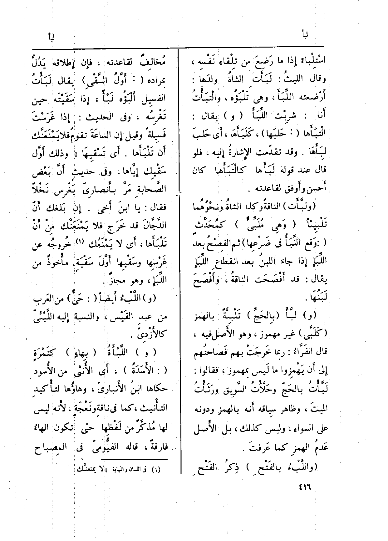 {اسْتِلْباءً إِذا مَا رَضِعَ من تِلْقاءِ نَفْسِ، وَقَالَ الليثُ:} لَبَأَتِ الشاةُ ولدَها: أَرْضعته اللِّبَأَ، وَهِي {تَلْبَؤُه،} والْتبَأْتُ أَنا: شربْت اللِّبَأَ (و) يُقَال: {الْتبَأَها (: حَلبَها) ، كَلَبَأَهَا، أَي حَلبَ} لِبَأَهَا. وَقد تقدّمت الإِشارةُ إِليه، فَلَو قَالَ عِنْد قَوْله {لَبَأَها} كالْتَبَأَها كَانَ أَحسن وأَوفق لقاعدته.
