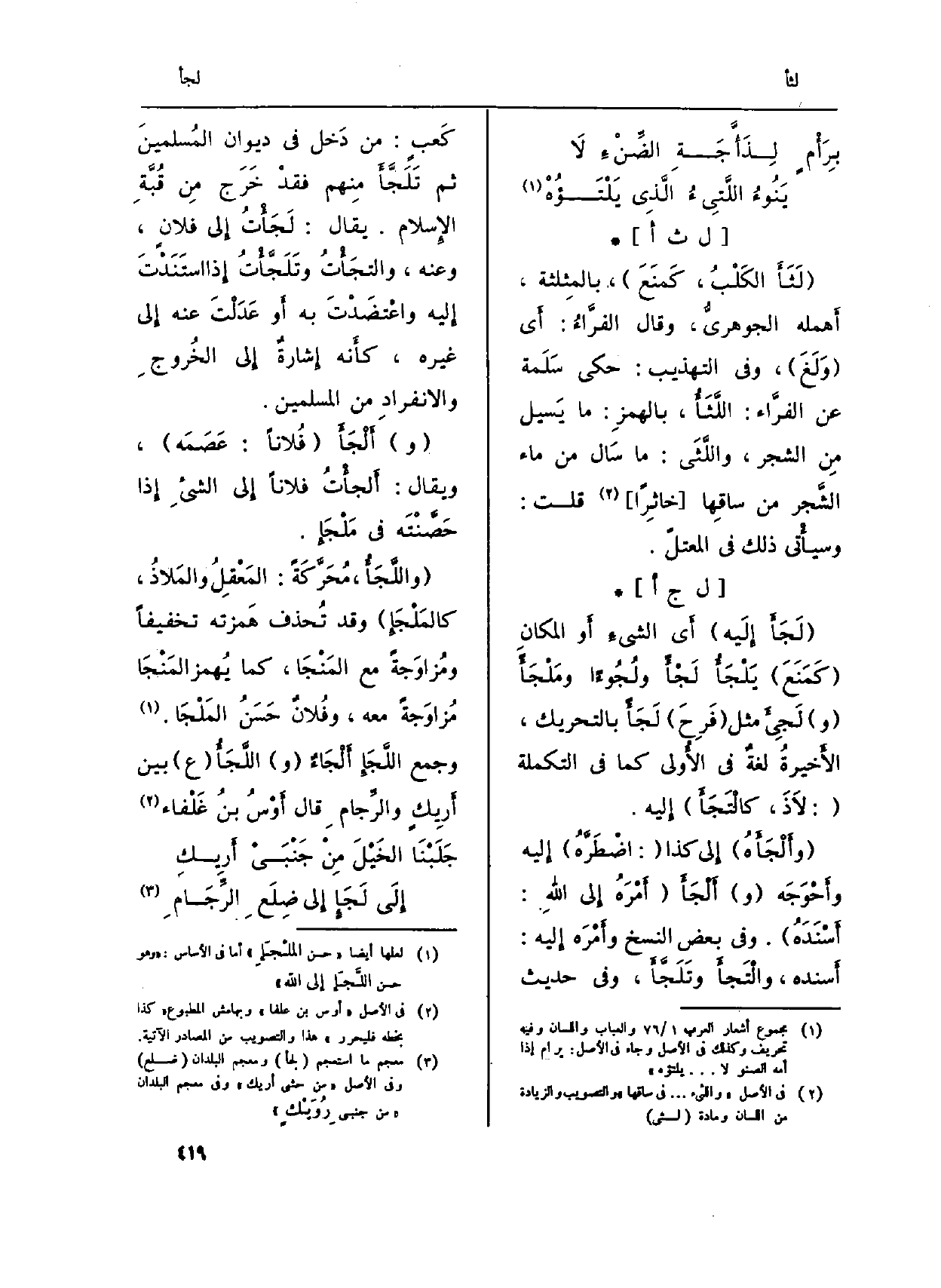 (} وأَلْجَأَهُ) إِلى كَذَا (: اضْطَرَّهُ) إِليه وأَحْوَجَه (و) {أَلْجَأَ (أَمْرَهُ إِلى اللَّهِ: أَسْنَدَهُ) . وَفِي بعض النّسخ وأَمْرَه إِليه: أَسنده،} والْتَجأَ {وتَلَجَّأَ، وَفِي حَدِيث كَعبٍ: من دَخل فِي ديوَان المُسلمينَ ثمَّ تَلَجَّأَ مِنهم فقدْ خَرَج مِن قُبَّةِ الإِسلام. يُقَال:} لَجَأْتُ إِلى فلانٍ، وَعنهُ، {والتجَأْتُ} وتَلَجَّأْتُ إِذا استَنَدْتَ إِليه واعْتَضَدْتَ بِهِ أَو عَدَلْتَ عَنهُ إِلى غَيره، كأَنه إِشارةٌ إِلى الخُروجِ والانفرادِ من الْمُسلمين. .