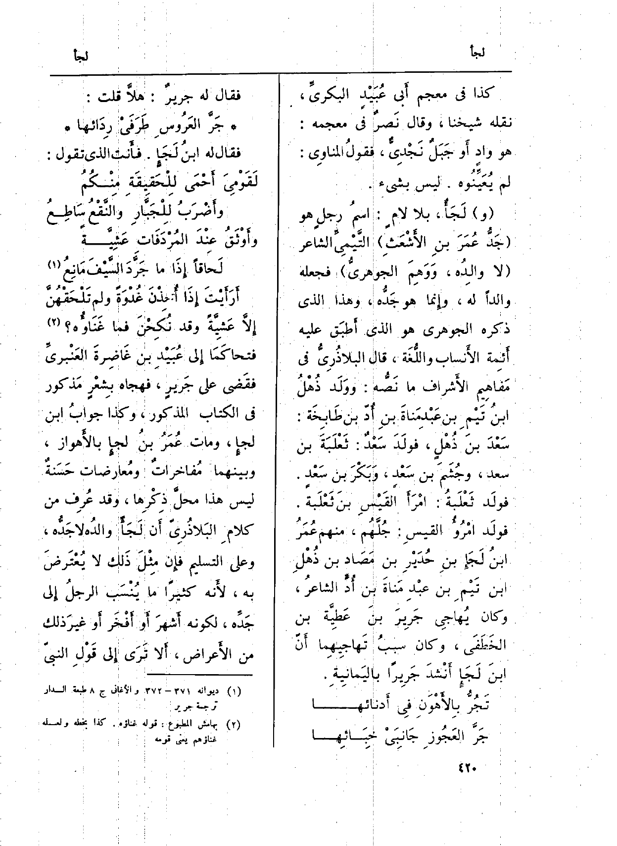 أَرَأَيْتَ إِذَا أُخِذْنَ غُدْوَةً وَلم تَلْحَقْهُنَّ إِلاَّ عَشِيَّةً وَقد نُكِحْنَ فَمَا غَنَاؤُه؟ فتحاكَما إِلى عُبَيْد بن غَاضرةَ العَنْبريِّ فقَضى على جَريرٍ، فهجاه بِشعْرٍ مَذكور فِي الْكتاب الْمَذْكُور، وَكَذَا جوابُ ابْن لجإٍ، وَمَات عُمَرُ بنُ لجإٍ بالأَهواز، وَبَينهمَا مُفاخراتٌ ومُعارضات حَسَنةٌ لَيْسَ هَذَا محلَّ ذِكْرِا، وَقد عُرِف من كلامِ البَلاذُرِيّ أَن لَجَأً والدُه لَا جَدُّه، وعَلى التَّسْلِيم فإِن مِثْلَ ذَلك لَا يُعْتَرضَ بِهِ، لأَنه كثيرا مَا يُنْسَب الرجلُ إِلى جَدِّه، لكَونه أَشهرَ أَو أَفْخَر أَو غير ذَلِك من الأَعراض، أَلا تَرَى إِلى قَوْلِ النبيّ