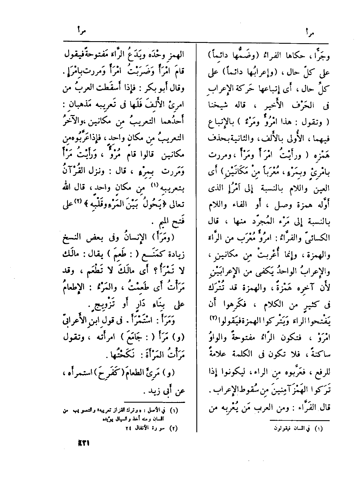 وجَرًّا، حَكَاهَا الفراءُ (وضَمُّها دائِماً) على كلّ حَال، (وإِعرابُها دَائِما) على كلِّ حَال، أَي إِتباعها حَركة الإِعرابَ فِي الحَرْف الأَخير، قَالَه شَيخنَا (وَتقول: هَذَا امْرُؤٌ {ومَرْؤٌ) بالإِتباع فيهمَا، الأُولى بالأَلف، وَالثَّانيَِة بِحَذْف هَمْزِه (ورأَيْتُ امْرَأً} ومَرْأً، ومررت {بامْرِىءٍ} وبِمَرْءٍ، مُعْرَباً مِنْ مَكَانَيْنِ) أَي الْعين وَاللَّام بِالنِّسْبَةِ إِلى {امرُإٍ الَّذِي أَوَّله همزَة وصل، أَو الْفَاء وَاللَّام بِالنِّسْبَةِ إِلى مَرْء المُجرّد مِنْهَا، قَالَ الكسائيّ والفرَّاءُ: امرُؤٌ مُعْرَب من الرَّاءَ والهمزة، وإِنما أُعْربتْ مِن مكانينِ، والإِعرابُ الواحدُ يَكفى من الإِعرابَيْنِ لأَن آخِر هَمْزةٌ، والهمزة قد تُتْرَك فِي كثيرٍ من الْكَلَام، فكَرِهوا أَن يَفْتحوا الراءَ وَيَتْركوا الْهمزَة فيَقولا امْرَوْ، فَتكون الرّاءُ مَفْتُوحَة والواوُ سَاكِنة، فَلَا تكون فِي الْكَلِمَة علامةٌ للرفع، فعَرَّبوه مِن الرَّاء، ليكونوا إِذا تَرَكوا الهَمْزَ آمِنينَ مِن سُقوط الإِعراب. قَالَ الفَرَّاء: وَمن الْعَرَب مَن يُعْرِبه من الهمزِ وحْدَه ويَدَعُ الرَّاءَ مَفتوحةً فَيَقُول قامَ امْرَأٌ وَضَرَبْتُ امْرَأً ومَررت بِامْرَإٍ. وَقَالَ أَبو بكر: فإِذا أَسقَطت العربُ من امرِيء الأَلِفَ فَلَها فِي تَعرِيبه مَذهبان: أَحدُهما التعريبُ مِن مكانين، والآخرُ التعريبُ مِن مكانٍ واحِدٍ، فإِذا عَرَّبُوه مِن مكانين قَالُوا قَامَ مُرْؤٌ، ورَأَيْتُ مَرْأً وَمعررت بِمِرْءٍ، قَالَ: وَنزل القُرْآن بتعريبهِ مِن مكانٍ واحدٍ، قَالَ الله تَعَالَى {يَحُولُ بَيْنَ الْمَرْء وَقَلْبِهِ} (الْأَنْفَال: 24) على فَتح الْمِيم.