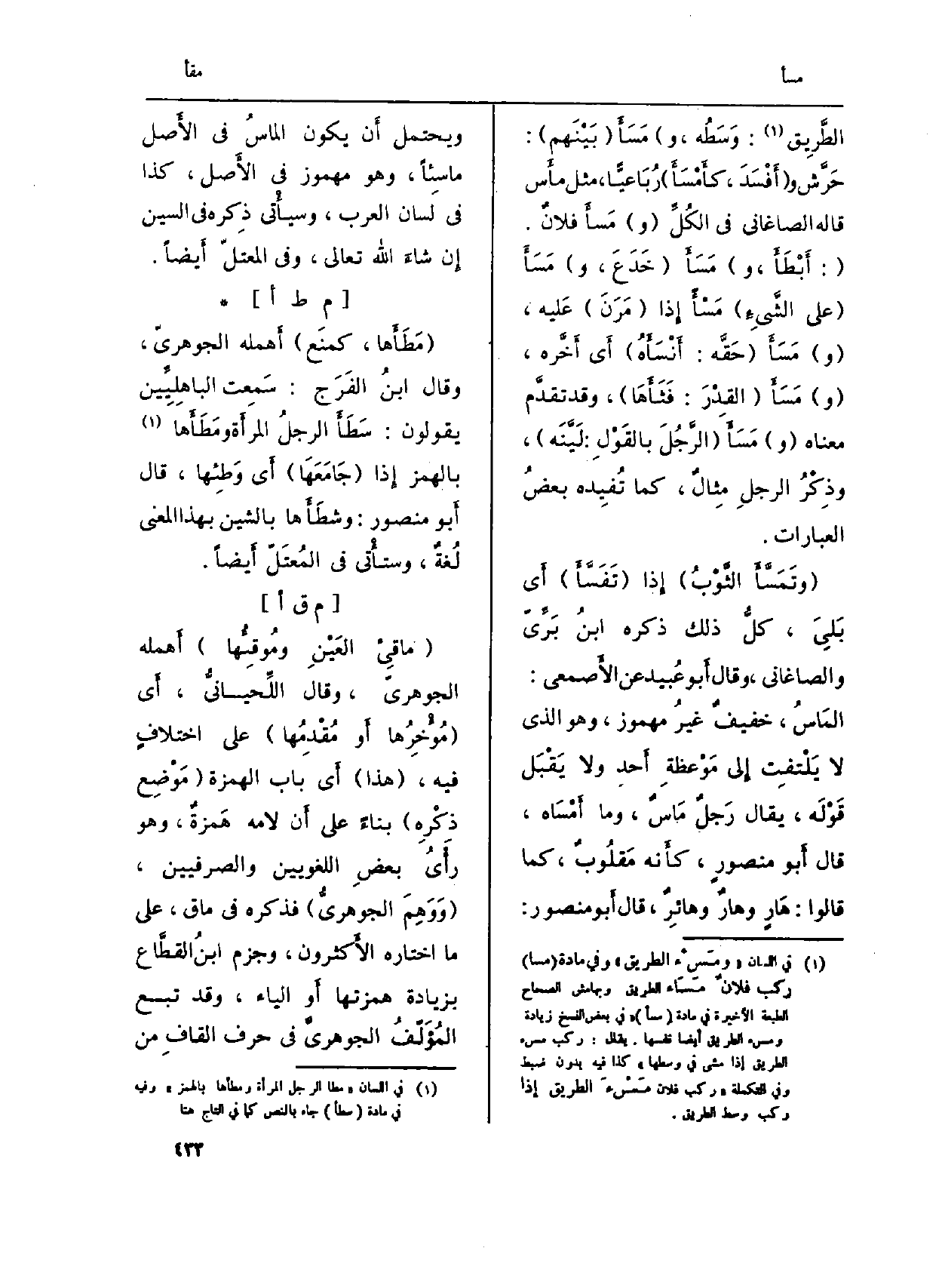 الطَّرِيق: وَسَطُه، و) مَسَأَ (بَيْنَهم) : حَرَّش و (أَفْسَدَ، {كأَمْسَأَ) رُبَاعيًّا، مثل مأَس قَالَه الصَّاغَانِي فِي الكُلِّ (و) مَسأَ فلانٌ. (: أَبْطَأَ، و) مَسَأَ (خَدَعَ، و) مَسَأَ (على الشَّيءِ) مَسْأً إِذا (مَرَنَ) عَليه، (و) مَسَأَ (حَقَّه: أَنْسَأَهُ) أَي أَخَّره، (و) مَسَأَ (القِدْرَ: فَثَأَهَا) ، وَقد تقدَّم مَعْنَاهُ (و) مَسَأَ (الرَّجُلَ بالقَوحلِ: لَيَّنَه) ، وذكْرُ الرجل مثالٌ، كَمَا تُفِيده بعضُ الْعبارَات.