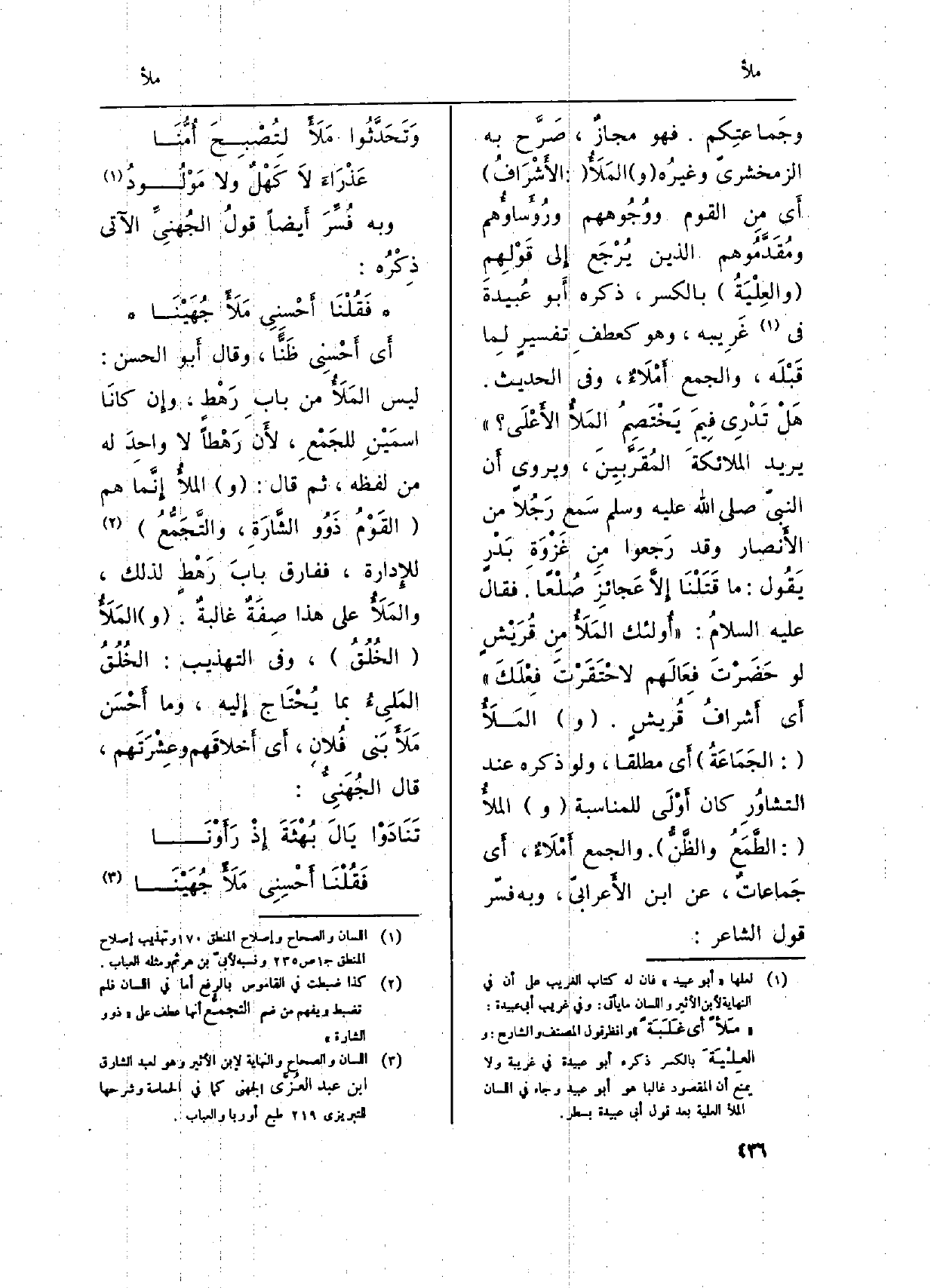 وجَماعتِكم. فَهُوَ مجازٌ، صَرَّح بِهِ الزَّمَخْشَرِيّ وغيرُه (و) المَلأُ (: الأَشْرَافُ) أَي من الْقَوْم ووُجُوههم ورُؤَساؤُهم ومُقَدَّمُوهم الَّذين يُرْجَع إِلى قَوْلِهِم (والعِلْيَةُ) بِالْكَسْرِ، ذكره أَبو عُبيدةَ فِي غَرِيبه، وَهُوَ كعطفِ تفسيرٍ لِما قَبْلَه، وَالْجمع أَمْلاَءٌ، وَفِي الحَدِيث. هَلْ تَدْرِي فِيمَ يَخْتَصِمُ المَلأُ الأَعْلَى؟) يُرِيد الملائكةَ المُقَرَّبِينَ، ويروى أَن النبيّ صلى الله عَلَيْهِ وسلمسَمع رَجُلاً من الأَنصار وَقد رَجعوا مِن غَزْوَةِ بَدْرٍ يَقُول: مَا قَتَلْنَا إِلاَّ عَجائِزَ صُلْعاً. فَقَالَ عَلَيْهِ السلامُ: (أُولئك المَلأُ مِن قُرَيْشٍ لَو حَضَرْتَ فِعَالَهم لاحْتَقَرْتَ فِعْلَكَ) أَي أَشرافُ قُريشٍ. (و) المَلأُ (: الجَمَاعَةُ) أَي مُطلقًا، وَلَو ذكره عِنْد التشاوُرِ كَانَ أَوْلَى للمناسبة (و) الملأُ (: الطَّمَعُ والظَّنُّ) . وَالْجمع أَمْلاَءٌ، أَي جَماعاتٌ، عَن ابْن الأَعرابيّ، وَبِه فسّر قَول الشَّاعِر: