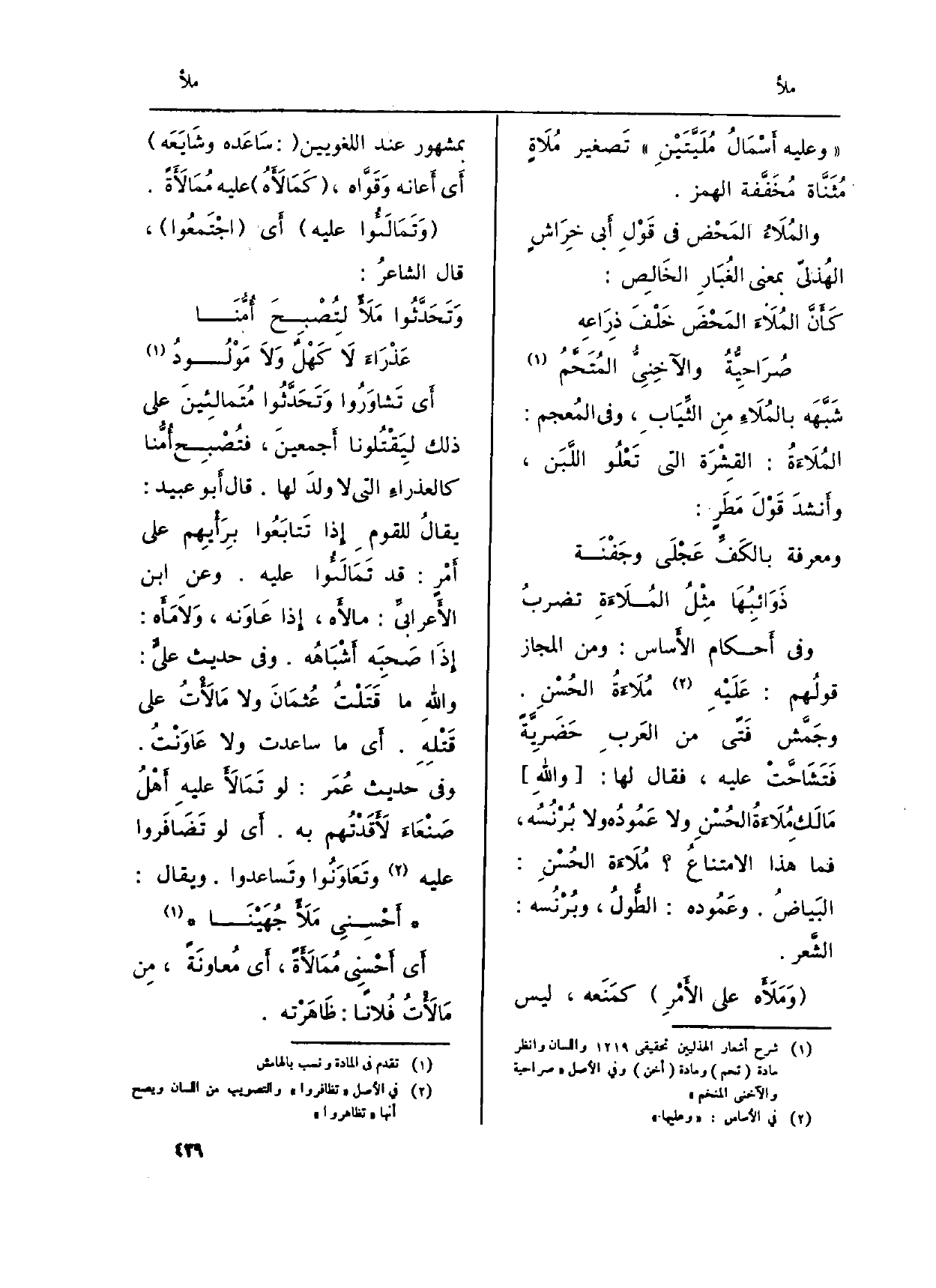 أَي تَشاوَرُوا وَتَحَدَّثُوا} مُتَمالِئينَ على ذَلِك لِيَقْتُلونا أَجمعينَ، فتُصْبِح أُمُّنا كالعذراءِ الَّتِي وَلَا ولدَ لَهَا. قَالَ أَبو عبيد: يقالُ للقومِ إِذا تَتابَعُوا بِرَأْيِهم على أَمْرٍ: قد تَمَالَئُوا عَلَيْهِ. وَعَن ابْن الأَعرابيِّ: مالأَه، إِذا عَاوَنه، وَلامَأَه: إِذَا صَحِبَه أَشْبَاهُه. وَفِي حَدِيث عليَ: واللَّهِ مَا قَتَلْتُ عُثمَانَ وَلَا {مَالأْتُ على قَتْلِهِ. أَي مَا ساعدت وَلَا عَاوَنْتُ. وَفِي حَدِيث عُمَر: لَو} تَمَالأَ عليهِ أَهْلُ صَنْعَاءَ لأَقَدْتُهم بِهِ. أَءَ لَو تَضَافَروا عَلَيْهِ وتَعَاوَنُوا وتَساعدو. وَيُقَال: