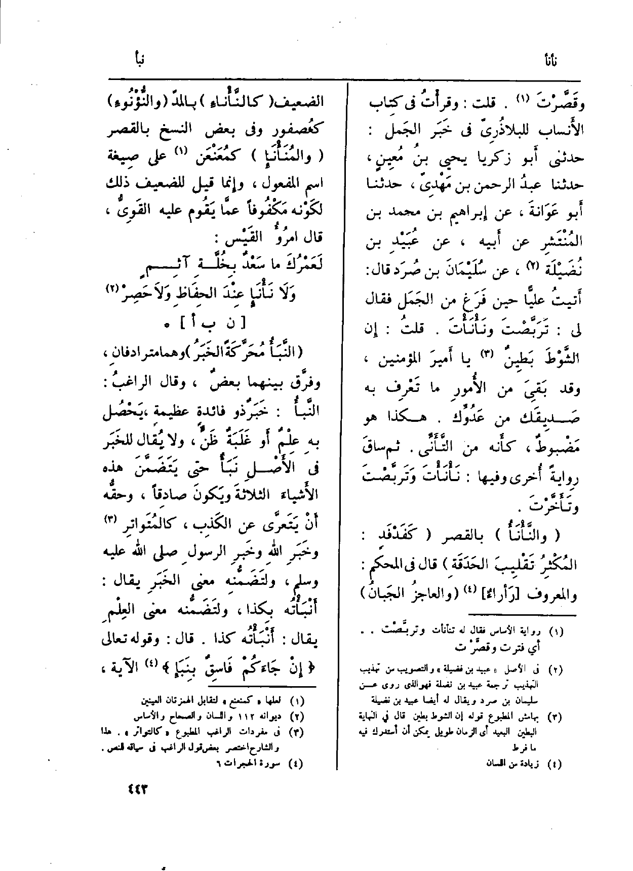 : ( {النَّبَأُ مُحَرَّكَةً الخَبَرُ) وهما مترادفانِ، وفرَّق بَينهمَا بعضٌ، وَقَالَ الراغبُ:} النَّبأُ: خَبَرٌ ذُو فائدةٍ عظيمةٍ، يَحْصُل بهِ عِلْمٌ أَو غَلَبَةٌ ظَنَ، وَلَا يُقال للخَبَر فِي الأَصْلِ {نَبَأٌ حَتَّى يَتَضَمَّنَ هَذِه الأَشياءَ الثلاثةَ ويَكونَ صادِقاً، وحقُّه أَنْ يَتَعرَّى عنِ الكَذِب، كالمُتَواتِر وخَبَرِ اللَّهِ وخَبرِ الرسولِ صلى الله عَلَيْهِ وَسلم ولتَضَمُّنِه معنى الخَبَرِ يُقَال: أَنْبَأْتُه بِكَذَا، ولتَضَمُّنه معنى العِلْمِ يُقَال:} أَنْبَأَتُه كَذَا. قَالَ: وَقَوله تَعَالَى: {1. 031 إِن جَاءَكُم فَاسق! بنبإ} (الحجرات: 6) الْآيَة،