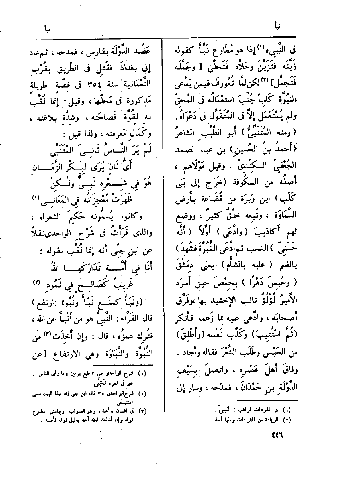 فِي {- النَّبِيءِ إِذا هُوَ مُطَاوع نَبَّأَ كَقَوْل زَيَّنَه فَتَزَيَّنَ وحَلاَّه فَتَحلَّى (وجَمَّلَه فَتَجمَّل) لَكِن لمَّا تُعُورفَ فِيمَن يَدَّعي النبُوَّة كَذِباً جُنِّبَ استعْمَالُه فِي المُحِقّ وَلم يُسْتَعْمَل إِلاَّ فِي المُتَقَوِّلِ فِي دَعْوَاهُ. (وَمِنْه} المُتَنَبّىءُ) أَبو الطَّيِّبِ الشاعرُ (أَحمدُ بنُ الحُسينِ) بن عبد الصَّمد الجُعْفِيّ الكِنْدِيّ، وَقيل مَوْلاَهم، أَصلُه من الكُوفة (خَرَج إِلى بَني كَلْب) ابْن وَبرَة من قُضَاعة بأَرض السَّمَاوَة، وتَبِعه خلْقٌ كثيرٌ، وَوضع لَهُم أَكاذيبَ (وادَّعَى) أَوَّلاً (أَنَّه حَسَنِيّ) النّسَب ثمَّ ادَّعَى النُّبُوَّةَ فشُهِدَ) بِالضَّمِّ (عَلَيْهِ بالشأْم) يَعْنِي دِمَشْقَ (وحُبِسَ دَهْراً) بِحِمْصِ حِين أَسرَه الأَميرُ لُؤْلُؤٌ نَائِب الإِخشيد بهَا، وفَرَّق أَصحابَه، وادَّعى عَلَيْهِ بِمَا زَعمه فأَنكر (ثُمَّ اسْتُتِيبَ) وكَذَّب نَفْسه (وأُطْلِقَ) من الحَبْس وطَلَب الشِّعْرَ فقاله وأَجاد، وفاقَ أَهلَ عَصْرِه، واتصلَ بِسَيْفِ الدَّوْلَةِ بنِ حَمْدَانَ، فمدَحه، وَسَار إِلى عَضُد الدَّوْلَة بفارِس، فمدحه، ثمَّ عَاد إِلى بغدادَ فقُتِل فِي الطّريق بقُرْبِ النَّعْمَانية سنة 354 فِي قِصّةٍ طويلةٍ مَذكورة فِي مَحلّها، وَقيل: إِنما لُقِّب بهِ لِقُوَّة فَصاحَته، وشِدَّةِ بلاغته، وكَمَالِ مَعرفته، وَلذَا قيل: