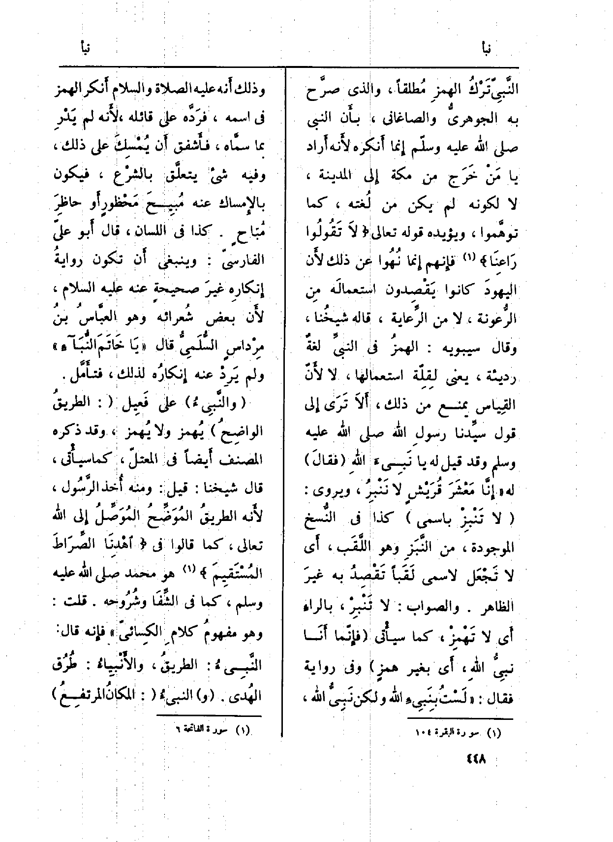 النَّبِيّ تَرْمُ الهمزِ مُطلقاً، وَالَّذِي صرَّح بِهِ الجوهريُّ والصاغاني، بأَن النَّبِي صلى الله عَلَيْهِ وسلمإِنما أَنكره لأَنه أَراد يَا مَنْ خَرَج من مَكَّة إِلى الْمَدِينَة، لَا لكَونه لم يكن من لُغته، كَمَا توهَّموا، وَيُؤَيِّدهُ قَوْله تَعَالَى: {لاَ تَقُولُواْ راعِنَا} (الْبَقَرَة: 104) فإِنهم إِنما نُهُوا عَن ذَلِك لأَن اليهودَ كَانُوا يَقْصِدون استعمالَه مِن الرُّعونة، لَا من الرِّعاية، قَالَه شيخُنا، وَقَالَ سِيبَوَيْهٍ: الهمزُ فِي النبيِّ لغةٌ رَدِيئَة، يَعْنِي لِقِلّة اسْتِعْمَالهَا، لَا لأَنّ القِياس يمْنَع من ذَلِك، أَلاَ تَرَى إِلى قَول سيِّدنا رسولِ الله صلى الله عَلَيْهِ وسلموقد قيل لَهُ يَا نَبيءَ اللَّهِ (فقالَ) لَهُ (إِنَّا مَعْشَرَ قُرَيْشٍ لَا نَنْبِرُ، ويروى: (لَا تَنْبِزْ باسمى) كَذَا فِي النُّسخ الْمَوْجُودَة، من النَّبَزِ وَهُوَ اللَّقَب، أَي لَا تَجْعَل لَا سمى لَقَباً تَقْصِدُ بِهِ غيرَ الظَّاهِر. وَالصَّوَاب: لَا تَنْبِرْ، بالراءِ أَي لَا تَهْمِزْ، كَمَا سيأْتي (فإِنّما أَنَا نبِيُّ اللَّهِ، أَي بِغَيْر همزٍ) وَفِي رِوَايَة فَقَالَ: (لَسْتُ {- بِنَبِيءِ اللَّه وَلَكِن نَبِيُّ الله، وَذَلِكَ أَنه عَلَيْهِ الصَّلَاة وَالسَّلَام أَنكر الْهَمْز فِي اسْمه، فرَدَّه على قَائِله، لأَنه لم يَدْرِ بِمَا سمَّاه، فأَشفق أَن يُمْسِكَ على ذَلِك، وَفِيه شَيْء يتعلَّق بالشرْع، فَيكون بالإِمساك عَنهُ مُبِيحَ مَحْظورٍ أَو حاظِرَ مُباحٍ. [كَذَا فِي (اللِّسَان) ، قَالَ أَبو عليّ الفارسيّ: وَيَنْبَغِي أَن تكون روايةُ إِنكارِه غيرَ صحيحةٍ عَنهُ عَلَيْهِ السَّلَام، لأَن بعض شُعرائه وَهُوَ العبَّاسُ بنُ مِرْداسٍ السُّلَمِيُّ قَالَ (يَا خَاتَمَ النُّبَآءِ) وَلم يَرِدْ عَنهُ إِنكارُه لذَلِك، فتأَمَّل.