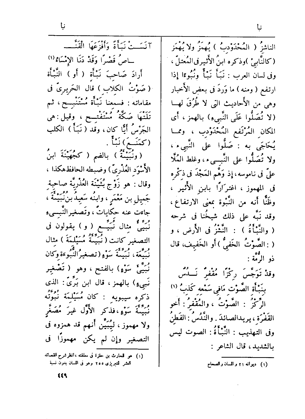 الناشِزُ (المُحْدَوْدِبُ) يُهمَزُ وَلَا يُهْمَز (كالنَّابِيء) وَذكره ابنُ الأَثير فِي المُعتلّ، وَفِي (لِسَان الْعَرَب) : نَبَأَ نَبْأً ونُبُوءًا إِذا ارْتَفع (وَمِنْه) مَا وَردَ فِي بعض الأَخبار وَهِي من الأَحاديث الَّتِي لَا طُرُقَ لَهَا (لَا تُصَلُّوا عَلَى النَّبِيءِ) بِالْهَمْز، أَي المكانِ المُرْتَفع المُحْدَوْدِب، وَمِمَّا يُحَاجَى بِهِ: صَلُّوا على النَّبِيء، وَلَا تُصَلُّوا على النَّبِيء، وَغلط المُلاَّ عليّ فِي ناموسه، إِذ وَهَّم المَجْدَ فِي ذِكْرِه فِي المهموز، اغترَاراً بابنِ الأَثير، وظَنًّا أَنه من النَّبْوة بِمَعْنى الِارْتفَاع، وَقد نَبَّه على ذَلِك شيخُنا فِي شَرحه ( {والنَّبْأَةُ) : النَّشْزُ فِي الأَرض، و (: الصَّوْتُ الخَفِيُّ) أَو الخَفِيف، قَالَ ذُو الرُّمَّة: