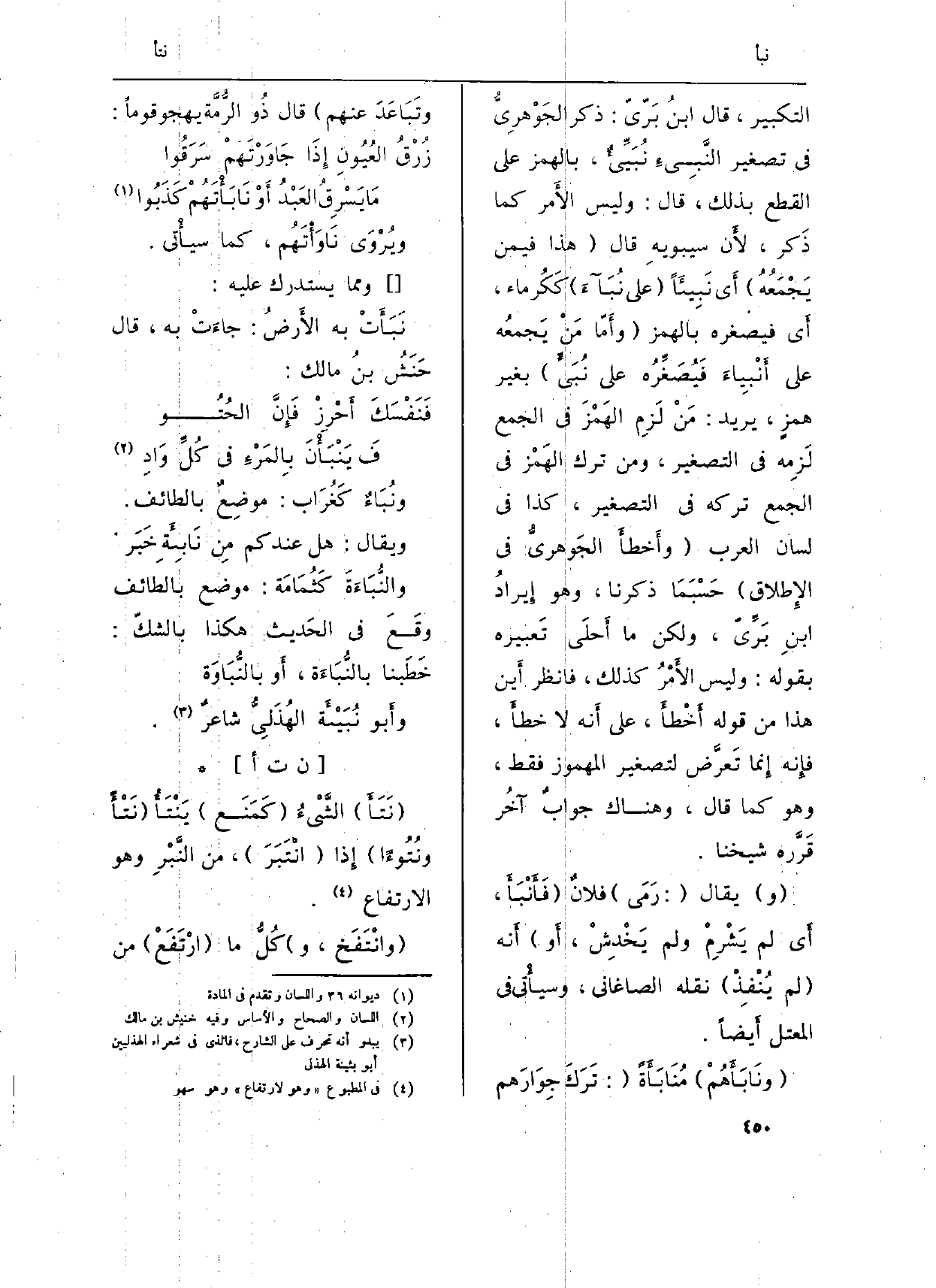 التَّكْبِير، قَالَ ابنُ بَرّيّ: ذكر الجَوْهَرِيُّ فِي تَصْغِير النَّبِيءِ {نُبَيّىءٌ، بِالْهَمْز على الْقطع بذلك، قَالَ: وَلَيْسَ الأَمر كَمَا ذَكر، لأَن سيبويهِ قَالَ (هَذَا فِيمَن يَجْمَعُهُ) أَي} نَبِيئَاً (على نُبَآءَ) كَكُرماء، أَي فيصغره بِالْهَمْز (وأَمّا مَنْ يَجمعُه على أَنْبِياءَ فَيُصَغِّرُه على {- نُبَيٍّ) بِغَيْر همزٍ، يُرِيد: مَنْ لَزِم الهَمْزَ فِي الْجمع لَزِمه فِي التصغير، وَمن ترك الهَمْز فِي الْجمع تَركه فِي التصغير، كَذَا فِي (لِسَان الْعَرَب) (وأَخطأَ الجَوهريُّ فِي الإِطلاق) حَسْبَمَا ذكرنَا، وَهُوَ إِيرادُ ابنِ بَرِّيّ، وَلَكِن مَا أَحلَى تَعبيره بقوله: وَلَيْسَ الأَمْرُ كَذَلِك، فَانْظُر أَين هَذَا من قَوْله أَخْطأَ، على أَنه لَا خطأَ، فإِنه إِنما تَعرَّض لتصغير المهموز فَقَط، وَهُوَ كَمَا قَالَ، وَهُنَاكَ جوابٌ آخُر قَرَّره شَيخنَا.