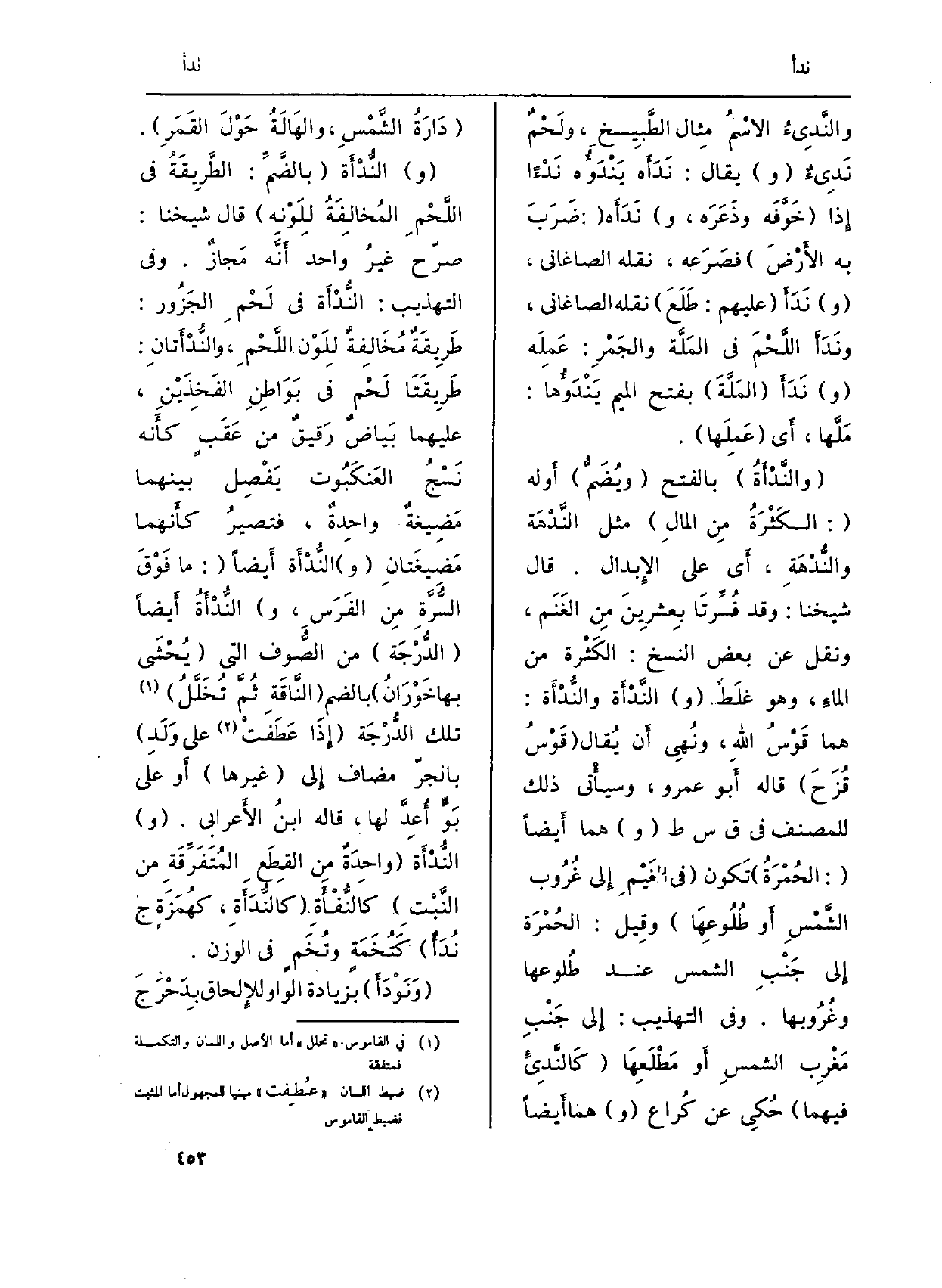 (} والنَّدْأَةُ) بِالْفَتْح (ويُضَمُّ) أَوله (: الكَثْرَةُ مِن المالِ) مثل النَّدْهَة والنُّدْهَةِ، أَي على الإِبدال. قَالَ شَيخنَا: وَقد فُسِّرتَا بِعشرِينَ مِن الغَنَم، وَنقل عَن بعض النّسخ: الكَثْرة من الماءِ، وَهُوَ غلَطٌ (و) النَّدْأَة {والنُّدْأَة: هما قَوْسُ اللَّهِ، ونُهِي أَن يُقال (قَوْسُ قُزَحَ) قَالَه أَبو عَمْرو، وسيأْتي ذَلِك للْمُصَنف فِي ق س ط (و) هما أَيضاً (: الجُمْرَةُ) تَكون (فِي الغَيْمِ إِلى غُرُوب الشَّمْسِ أَو طُلُوعِهَا) وقِيل: الحُمْرَة إِلى جَنْبِ الشَّمْس عِنْد طُلوعها وغُرُوبها. وَفِي (التَّهْذِيب) : إِلى جَنْبِ مَغْرِب الشمسِ أَو مَطْلَعِهَا (كَالنَّدِيءِ فيهمَا) حُكَي عَن كُراع (و) هما أَيضاً (دَارَةُ الشَّمْسِ، والهَالَةُ حَوْلَ القَمَرِ) .