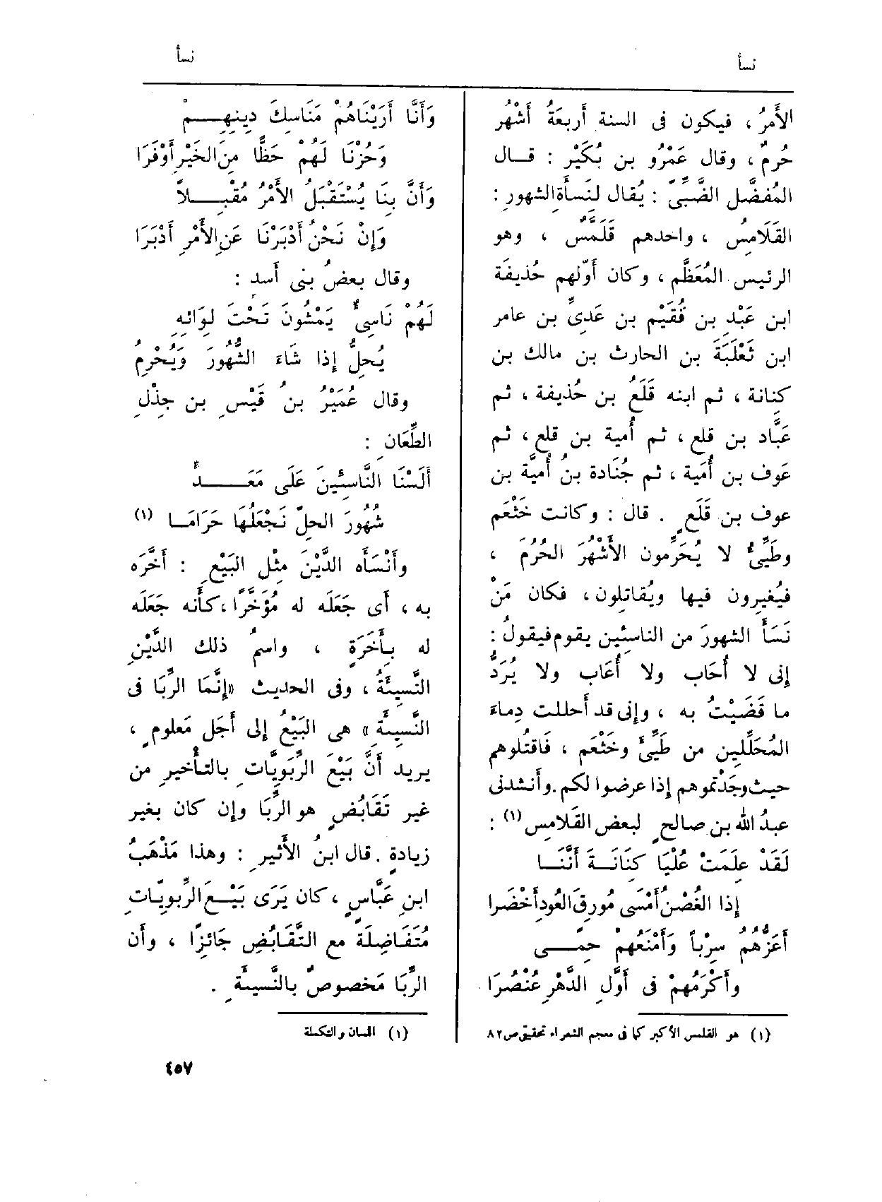 الأَمرُ، فَيكون فِي السّنة أَربعَةُ أَشْهُر حُرمٌ، وَقَالَ عَمْرُو بن بُكَيْر: قَالَ المُفضَّل الضَّبِّيّ: يُقال {لِنَسأَةِ الشهورِ: القَلاَمِسُ، واحدهم قَلَمَّسٌ، وَهُوَ الرئيس المُعَظَّم، وَكَانَ أَوّلهم حُذيفَة ابْن عَبْدِ بن فُقَيْم بن عَدِيِّ بن عَامر ابْن ثَعْلَبَةَ بن الْحَارِث بن مَالك بن كِنانة، ثمَّ ابْنه قَلَعُ بن حُذيفة، ثمَّ عَبَّاد بن قلع، ثمَّ أُمية بن قلع، ثمَّ عَوف بن أُمَية، ثمَّ جُنَادة بنُ أُميَّة بن عَوْف بن قَلَعٍ. قَالَ: وَكَانَت خَثْعَم وطَيِّيءُ لَا يُحَرِّمون الأَشْهُرَ الحُرُمَ، فيُغيِرون فِيهَا ويُقاتِلون، فَكَانَ مَنْ نَسَأَ الشهورَ من} الناسِئين يقوم فيقولُ: إِني لَا أُحَاب وَلَا أُعَاب وَلَا يُرَدُّ مَا قَضَيْتُ بِهِ، وإِني قد أَحللت دِماءَ المُحَلِّلِين من طَيِّيءَ وخَثْعَم، فَاقتُلوهم حَيْثُ وجَدْتموهم إِذا عرضوا لكم. وأَنشدني عبدُ الله بن صالحٍ لبَعض القَلامِس: