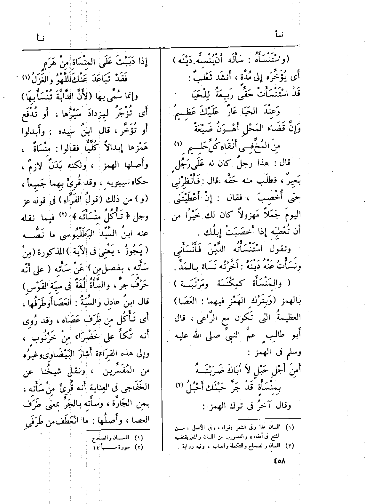 وإِنما سُمِّي بهَا (لأَنَّ الدَّابَّةَ {تُنْسَأُ بِهَا) أَي تُزْجَرُ لِيزدادَ سَيْرُها، أَو تُدْفَع أَو تُؤَخَّر، قَالَ ابنُ سَيّده: وأَبدلوا هَمْزها إِبدالاً كُلِّيًّا فَقَالُوا:} مِنْسَاةٌ، وأَصلها الْهَمْز، وَلكنه بَدَلٌ لازمٌ، حَكَاهُ سيبويهِ، وَقد قُرِيءَ بِهما جَمِيعاً، (و) من ذَلِك (قولُ الفَرَّاءِ) فِي قَوْله عز وَجل {تَأْكُلُ! مِنسَأَتَهُ} (سبأ: 14) فِيمَا نَقله عَنهُ ابنُ السَّيّد البَطَلْيُوسي مَا نَصُّه (يَجُوزُ، يَعْنِي فِي الْآيَة) الْمَذْكُورَة (مِنْ سَأَتِهِ، بفصل مِن) عَنْ سَأَتِه (على أَنّه حَرْفُ جرَ، والسَّأَةُ لُغَةٌ فِي سِيَةِ القَوْسِ) قَالَ ابنُ عادِل والسِّيَةُ: العَصَا أَو طَرَفُها، أَي تَأْكُل مِن طَرَف عَصَاه، وَقد رُوِي أَنه اتَّكأَ على خَضْرَاءَ مِنْ خَرْنُوبٍ، وإِلى هَذِه القِرَاءَة أَشارَ البَيْضَاوِي وغيرُه من المُفَسِّرين، وَنقل شيخُنا عَن الخَفَاجي فِي العِناية أَنه قُرِىءَ مِنْ سَأَتِه، بمِن الجَارَّة، وسأَتِه بالجَرِّ بِمَعْنى طَرَف الْعَصَا، وأَصلُها، مَا انْعَطَفَ من طَرَفَيِ