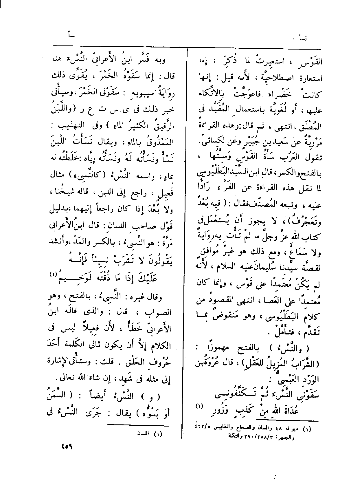 القَوْسِ، استعِيرتْ لما ذُكِرَ، إِما اسْتِعَارَة اصطلاحِيَّة، لأَنه قيل: إِنها كانتْ خَضْراءَ فاعوَجَّتْ بالاتِّكاء عَلَيْهَا، أَو لُغَوَّية باستعمالِ المُقَيَّد فِي المُطْلَق، انْتهى، ثمَّ قَالَ: وَهَذِه القراءَةُ مَرْوِيَّةٌ عَن سَعيد بن جُبَيْرٍ وَعَن الكسائيّ. تَقول العَرُب سَأَةُ القَوْسِ وَسِئَتُها، بِالْفَتْح وَالْكَسْر، قَالَ ابْن السَّيّد البَطَلْيُوسي لما نقل هَذِه القراءَة عَن الفَرَّاءِ رَادًّا عَلَيْهِ، وَتَبعهُ المُصنّف فَقَالَ: (فِيه بُعْدٌ وتَعَجْزُفٌ) ، لَا يجوز أَن يُستعْمَل فِي كتاب اللَّهِ عزَّ وجلَّ مَا لمْ تَأْتِ بِهِ رِوَايةٌ وَلَا سَمَاعٌ، وَمَعَ ذَلِك هُوَ غيرُ مُوافِقٍ لقصَّة سيِّدِنا سُليمانَ عَلَيْهِ السَّلَام، لأَنه لم يَكُنْ مُعتَمِداً على قَوْس، وإِنما كَانَ مُعتمِداً على العَصا، انْتهى المقصودُ من كَلَام البَطَلْيُوسي، وَهُوَ مَنقوضٌ بِمَا تَقدَّم فتأَمَّلْ.
