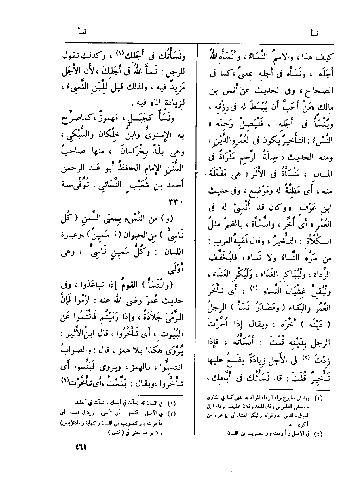 كَيفَ هَذَا، والاسمُ النَّسَاءُ، وأَنْسَأَه اللَّهُ أَجَلَه، ونَسَأَه فِي أَجلِه بِمَعْنى، كَمَا فِي (الصِّحَاح) ، وَفِي الحَدِيث عَن أَنس بن مَالك (مَنْ أَحَبَّ أَن يُبْسَطَ لَهُ فِي رِزْقِه، ويُنْسَأَ فِي أَجَلِه، فَلْيَصِلْ رَحِمَه) النَّسْءُ: التأْخيرُ يكون فِي العُمُرِ والدَّيْنِ، وَمِنْه الحَدِيث (صِلَةُ الرَّحِم مَثْرَاةٌ فِي المالِ، {مَنْسَأَةٌ فِي الأَثَر) هِيَ مَفْعَلَة مِنْهُ، أَي مَظِنَّةٌ لَهُ ومَوْضِع، وَفِي حَدِيث ابنِ عَوْفٍ (وَكَانَ قد} أُنْسِىء لَهُ فِي العُمُرِ) أَي أُخِّر، {والنُّسْأَة، بالضمّ مثلُ الكُلأَةِ: التأْخيرُ، وَقَالَ فَقِيهُ العربِ: من سَرَّه} النَّساءُ وَلَا نَساءَ، فليُخَفِّف الرِّداءَ، ولْيُبَاكِرِ الغَدَاءَ، وَلْيُكْرِ العَشَاءَ، ولْيُقِلَّ غِشْيَانَ النَّساءِ، أَي تأَخّر العُمُر والبَقاء (ومَصْدَرُ نَسَأَ) الرجلُ العُمُر والبَقاء (ومَصْدَرُ نَسَأَ) الرجلُ (دَيْنَه) أَخَّرَه، وَيُقَال إِذا أَخَّرْتَ الرجل بِدَيْنِه قُلْتَ؛ {أَنْسَأْتُه، فإِذا زِدْتَ فِي الأَجل زِيادَةً يقَعُ عَلَيْهَا تَأْخِيرٌ قُلْتَ؛ قد} نَسَأْتُك فِي أَيَّامِك، ونَسَأْتُك فِي أَجَلِك، وَكَذَلِكَ تَقول للرجل: نَسأَ اللَّهُ فِي أَجَلِك، لأَن الأَجَل مَزِيدٌ فِيهِ، وَلذَلِك قيل لِلَّبَنِ النَّسِيءُ، لِزيادةِ الماءِ فِيهِ.