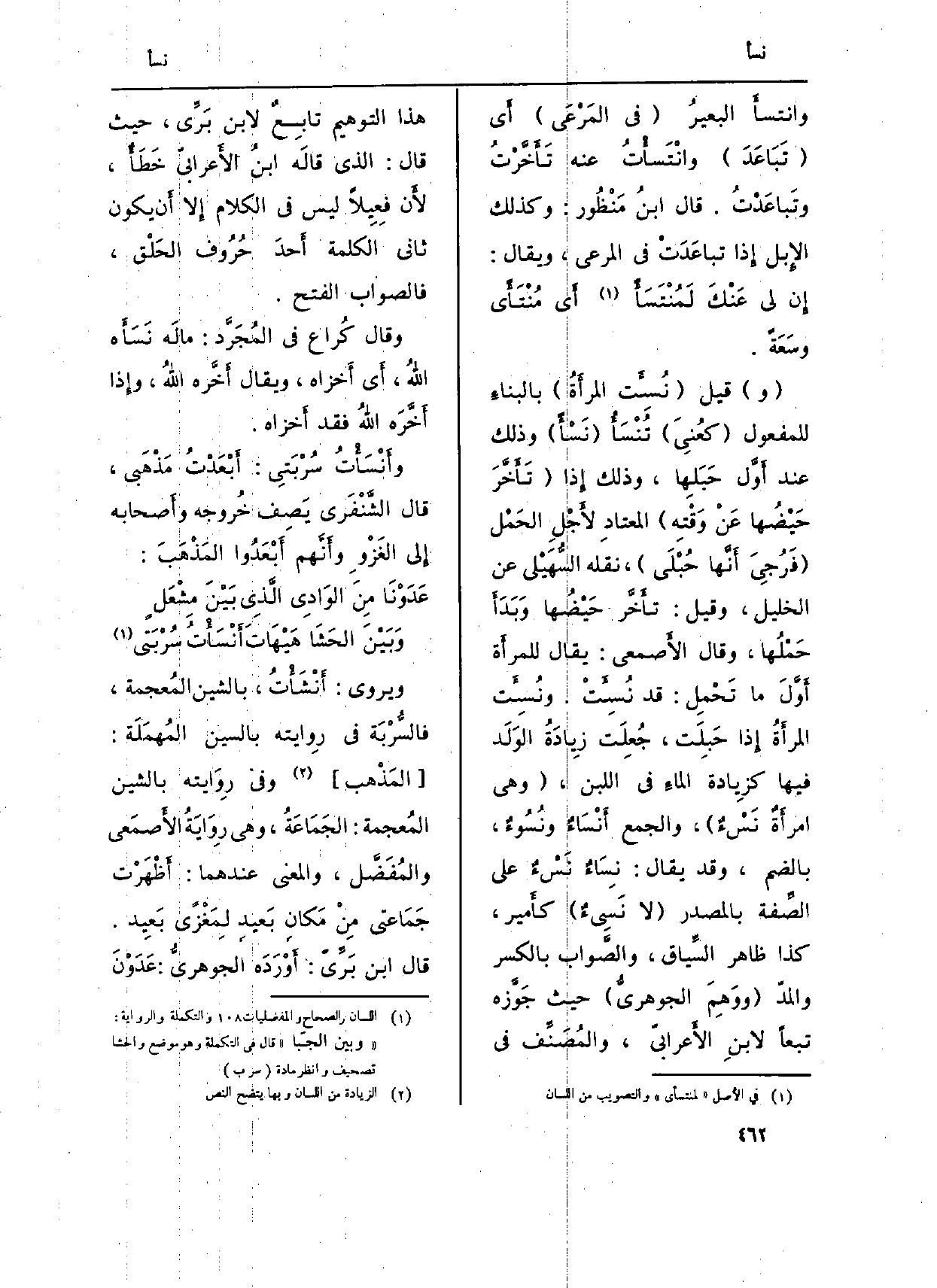 (و) قيل (} نُسِئَت المرأَةُ) بالبناءِ للْمَفْعُول (كعُنِيَ) {تُنْسَأُ (} نَسْأً) وَذَلِكَ عِنْد أَوَّل حَبَلِها، وَذَلِكَ إِذا (تَأَخَّرَ حَيْضُها عَنْ وَقْتِه) المعتادِ لأَجْلِ الحَمْل (فَرُجِيَ أَنَّها حُبْلَى) ، نَقله السُّهَيْلي عَن الْخَلِيل، وَقيل: تأَخَّر حَيْضُها وَبَدَأَ حَمْلُها، وَقَالَ الأَصمعي: يقغال للمرأَة أَوَّلَ مَا تَحْمِل: قد نُسِئَتْ. ونُسِئَت المرأَةُ إِذا حَبِلَت، جُعِلَت زِيادَةُ الوَلَد فِيهَا كزيِادة الماءِ فِي اللَّبن، (وَهِي امرأَةٌ نَسْءٌ) ، وَالْجمع أَنْسَاءٌ ونُسُوءٌ، بِالضَّمِّ، وَقد يُقَال: نسَاءٌ نَسْءٌ على الصِّفة بِالْمَصْدَرِ (لَا نَسِيءٌ) كأَمير، كَذَا ظَاهر السِّياق، والصَّواب بِالْكَسْرِ والمدّ (ووَهِمَ الجوهريُّ) حَيْثُ جَوَّزوه تبعا لابنِ الأَعرابيّ، والمُصَنِّف فِي هَذَا التوهيم تابِعٌ لِابْنِ بَرِّي، حَيْثُ قَالَ: الَّذِي قالَه ابنُ الأَعرابيّ خَطَأٌ، لأَن فِعِيلاً لَيْسَ فِي الْكَلَام إِلا أَن يكون ثَانِي الْكَلِمَة أَحدَ حُرُوف الحَلْق، فَالصَّوَاب الْفَتْح.
